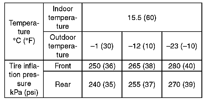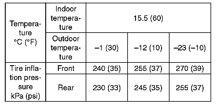 ^ When adjusting tire inflation pressure indoors in winter, there is a big temperature difference between the indoor facilities and outside. Once the car is outside where the temperature is lower, the air pressure in the tires will drop, causing the tire inflation pressure warning light to illuminate, even if the pressure in the tires was adjusted to standard values indoors. To avoid this, it is necessary to adjust the tire inflation pressure to the high side in consideration of the difference in temperature between inside and outside according to the following table.