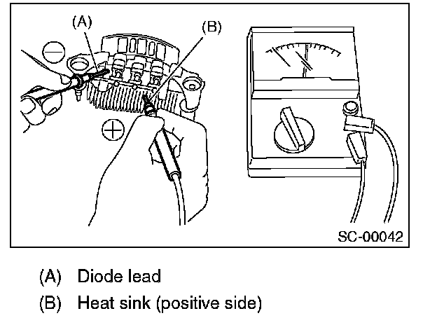 1. Check for continuity between the diode lead and positive side heat sink. If resistance is 1 Ohm or more only in the direction from the diode lead to the heat sink, replace the rectifier.
