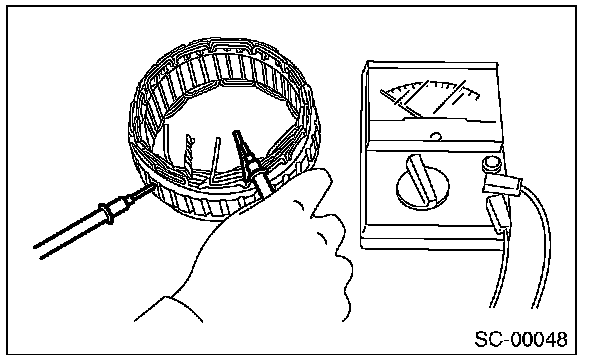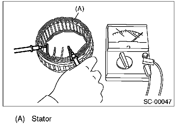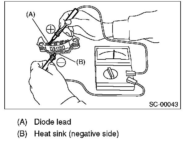 2. Check for continuity between the negative side heat sink and diode lead. If resistance is 1 Ohm or more only in the direction from the heat sink to the diode lead, replace the rectifier.