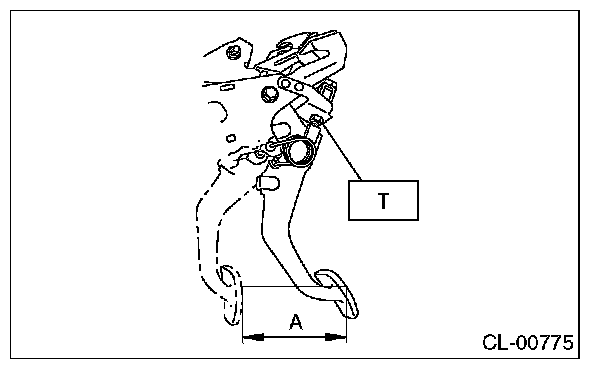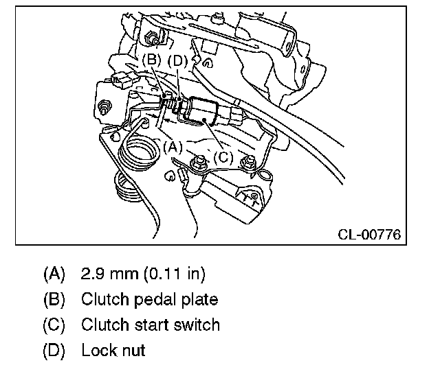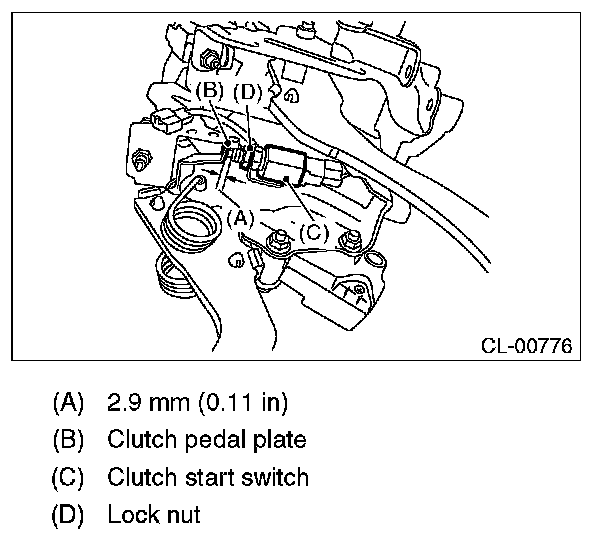 2) Install so that gap (A) of the clutch pedal plate and clutch start switch is 2.9 mm (0.11 in), and tighten the lock nut.
