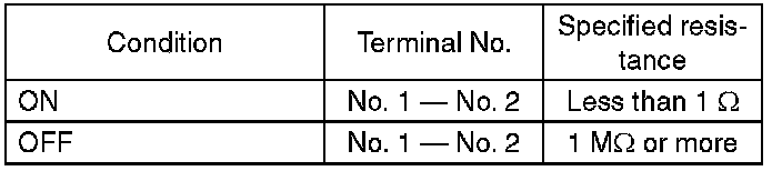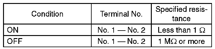 (2) Measure the resistance between terminal 1 and 2 of the switch. If the resistance is not within the specification, check the clutch stroke and installation condition, and check the clutch switch again.