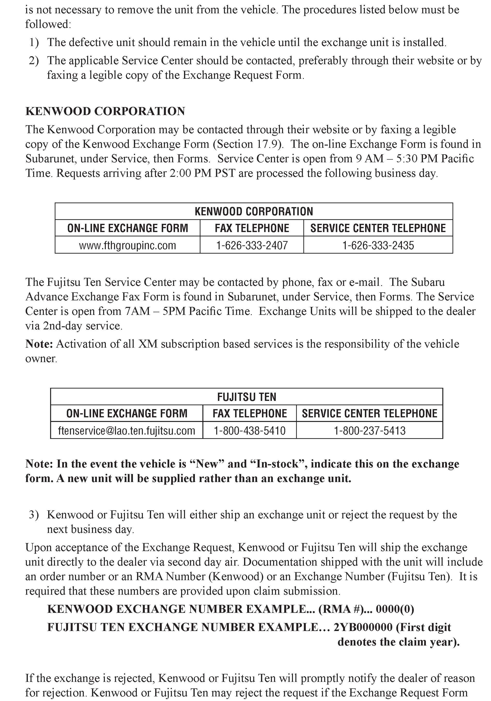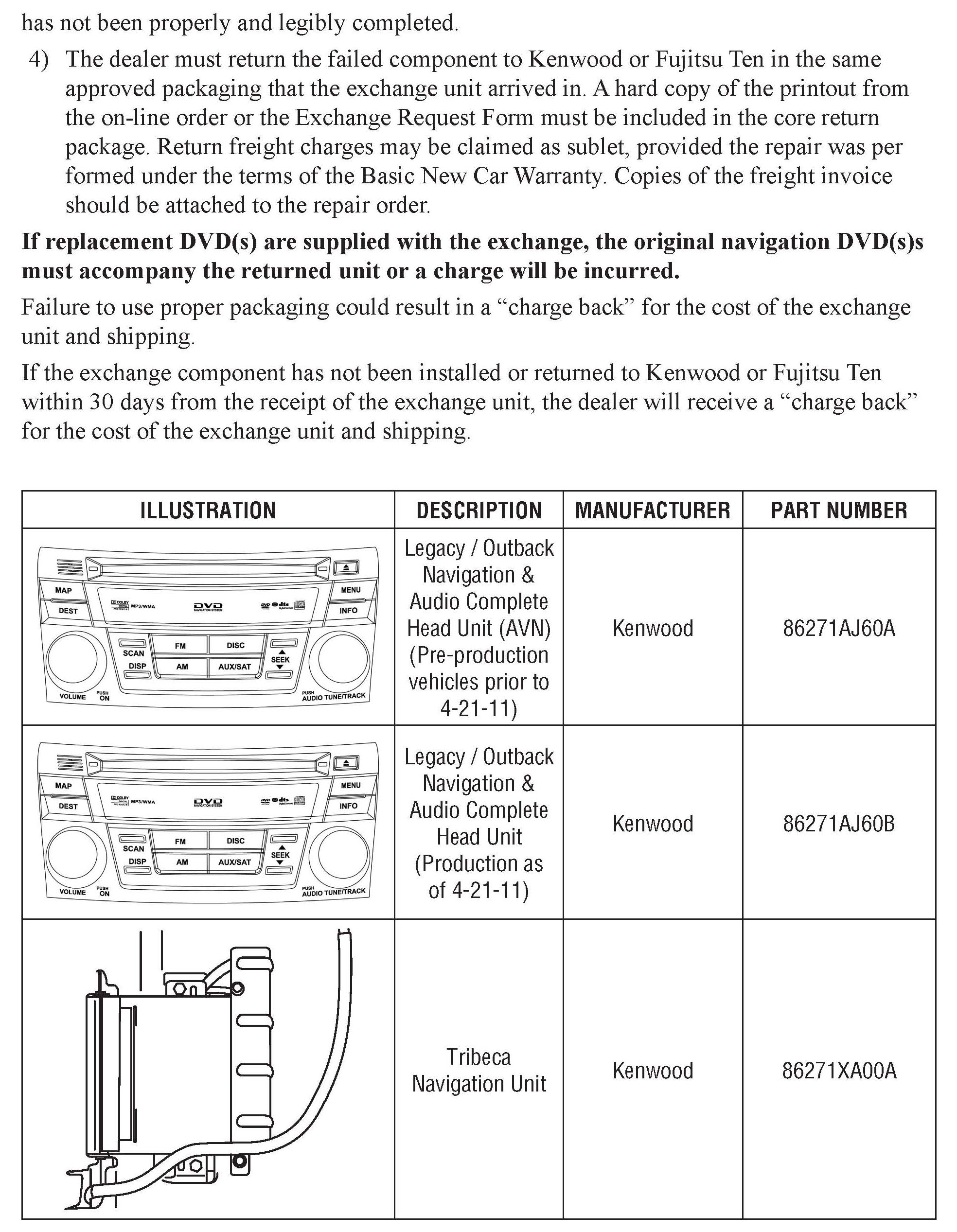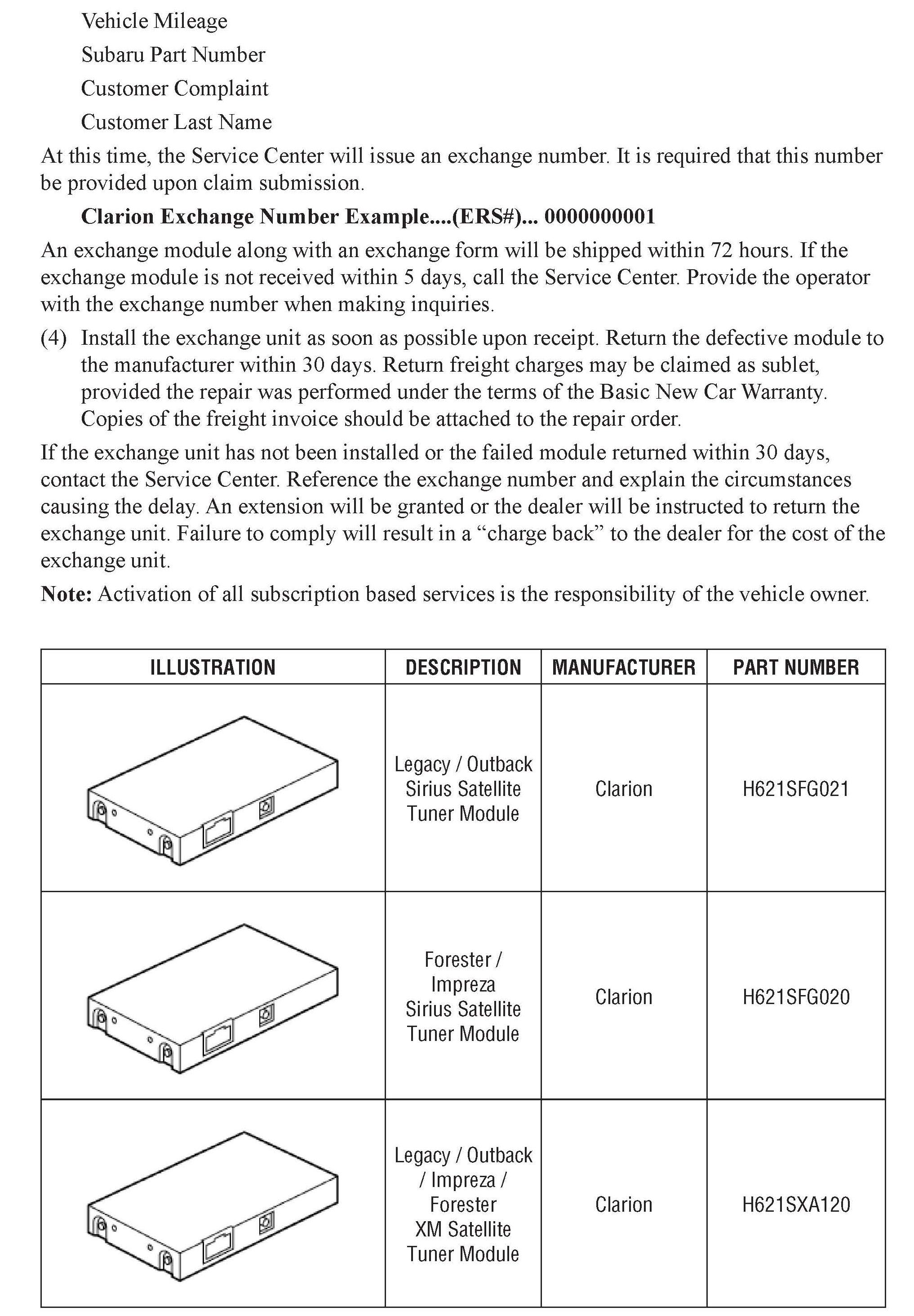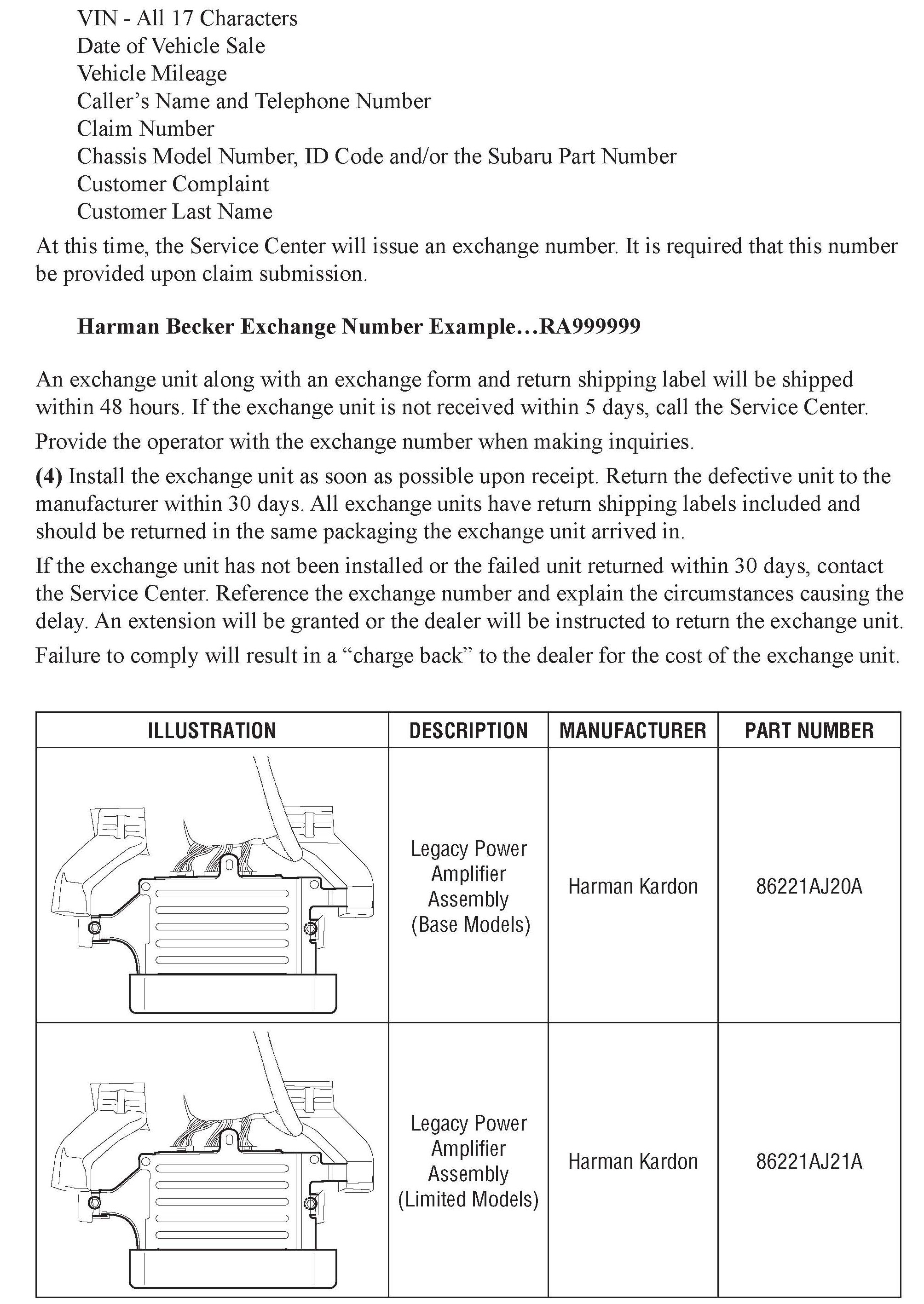 This bulletin contains illustrations of exchange components and their manufacturer as well as a description of the proper exchange procedure. The exchange program policy can also be found in Sections 8.4.9 and 11.2.10 of your Service Policies and Procedures Manual found in subarunet