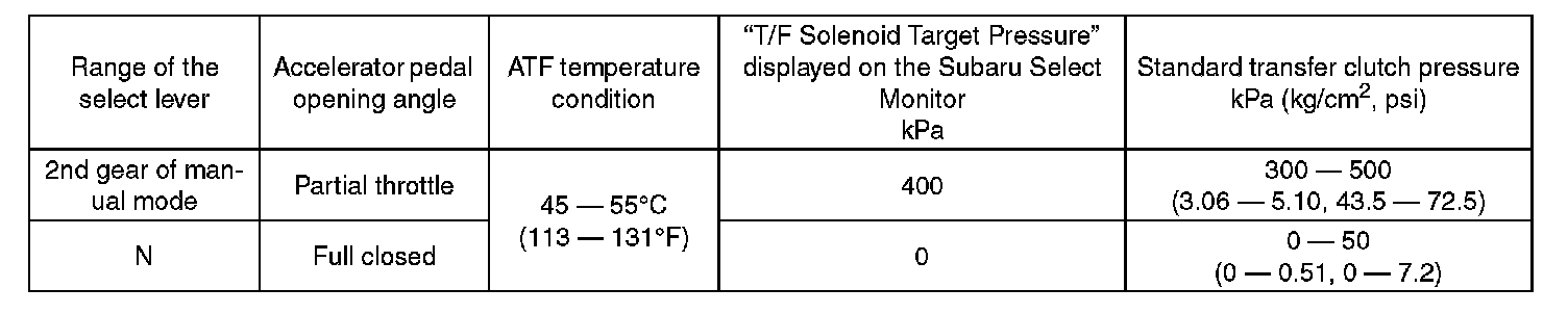 ^ Adjust the accelerator pedal opening angle in order to obtain the "T/F solenoid target pressure" displayed on the Subaru Select Monitor.