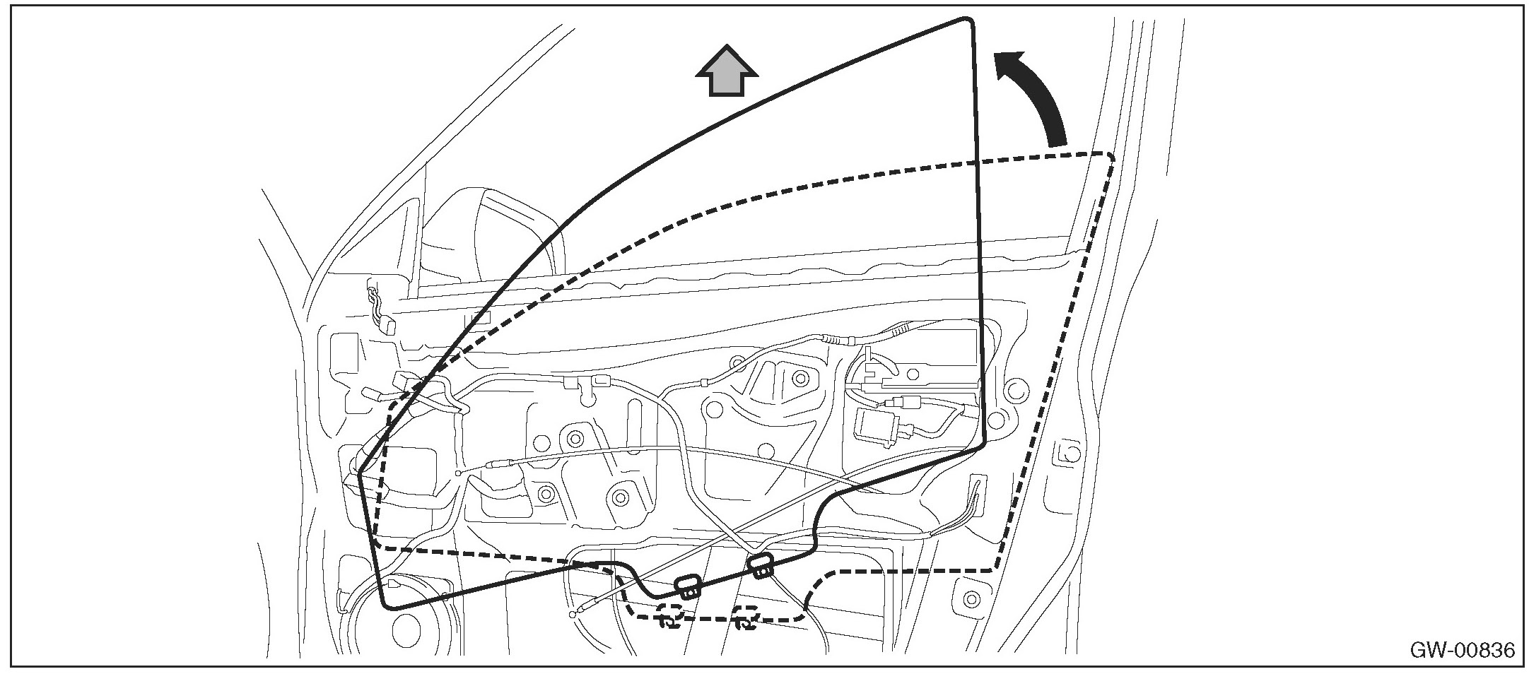 CAUTION: Make sure that the glass run rubber is placed securely in the door frame and sash.