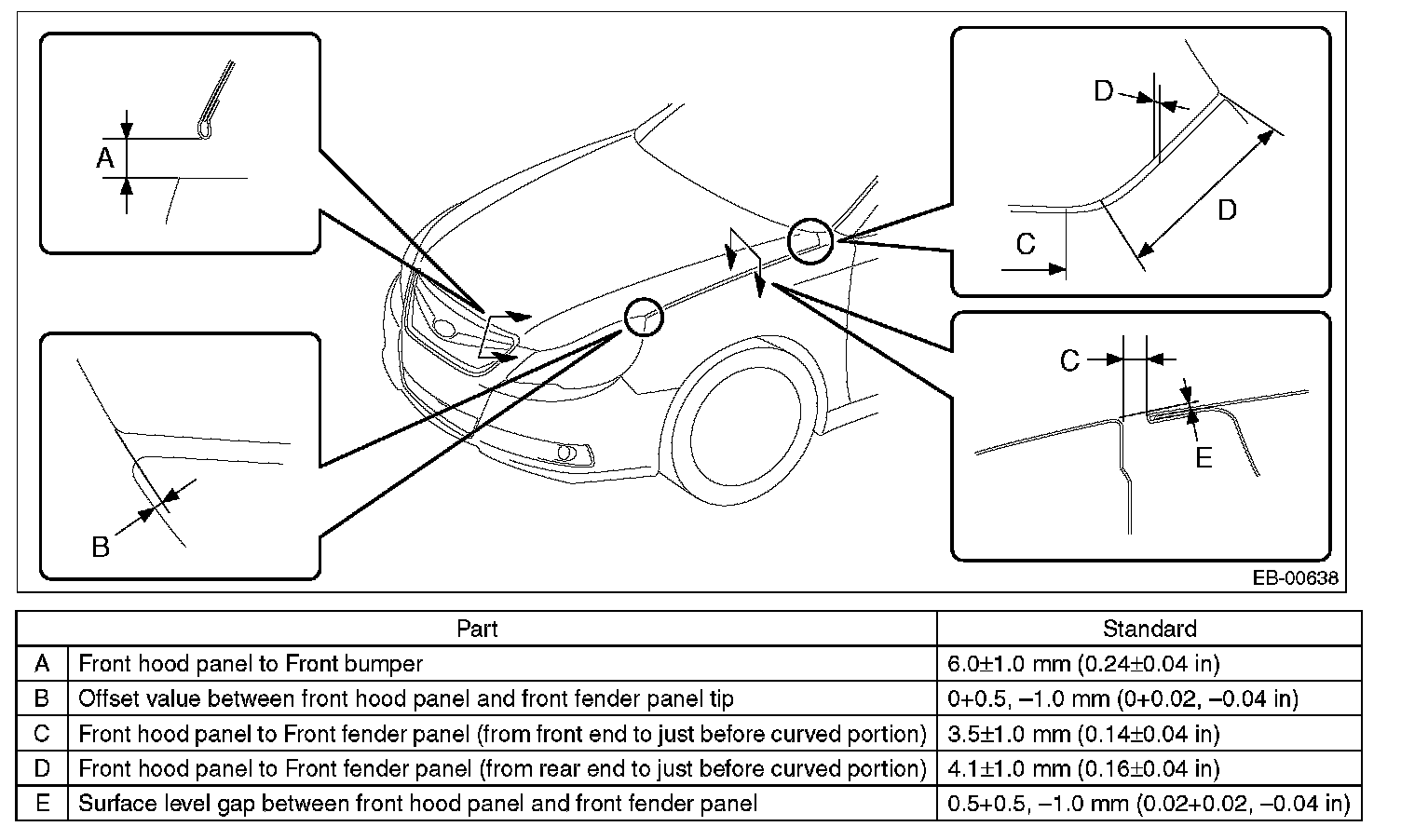Adjust the clearance around the front hood panel as follows.