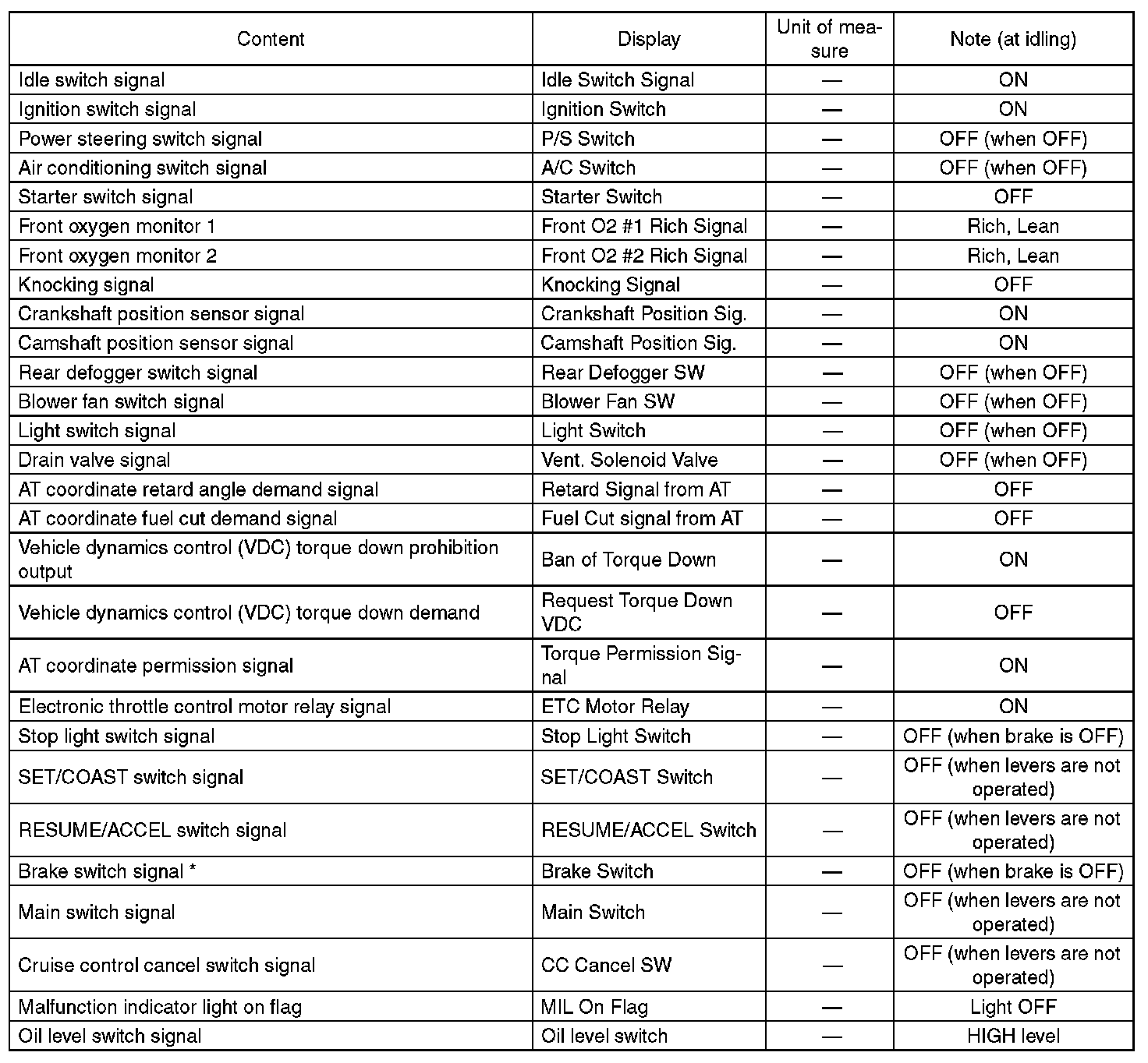 - *: For models without cruise control, the brake switch signal does not change.