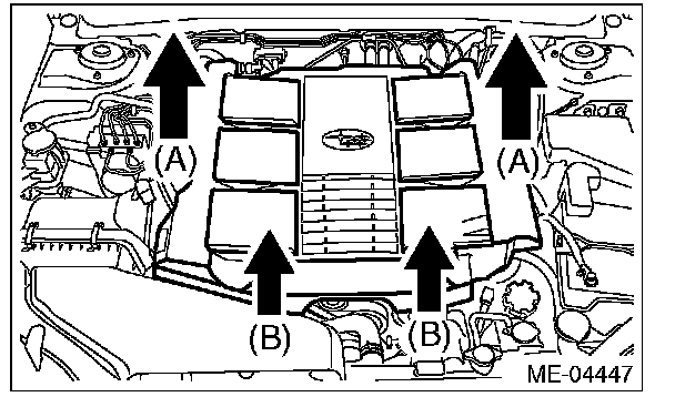 (2) Lift up the front side holding two positions (B) while moving it in the forward direction of the vehicle.