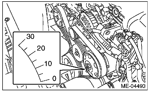 12) Start the engine, turn the timing light to the crank pulley, and check the ignition timing through the chain cover gauge.