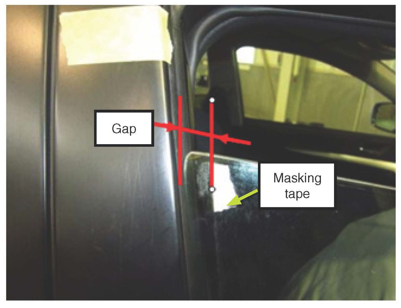 ^ Determine if the front door glass is tilting forward when opening. With the window fully closed, put a piece of masking tape vertically on the glass near the top corner parallel to and against the rubber weather stripping (glass run channel). Lower the window a couple inches then see if the masking tape has moved away from the run channel creating a gap as shown in the photo. If a gap is verified, the joint between the upper and lower window sash will need to be inspected for a misalignment condition causing the glass to bind in the run channel.