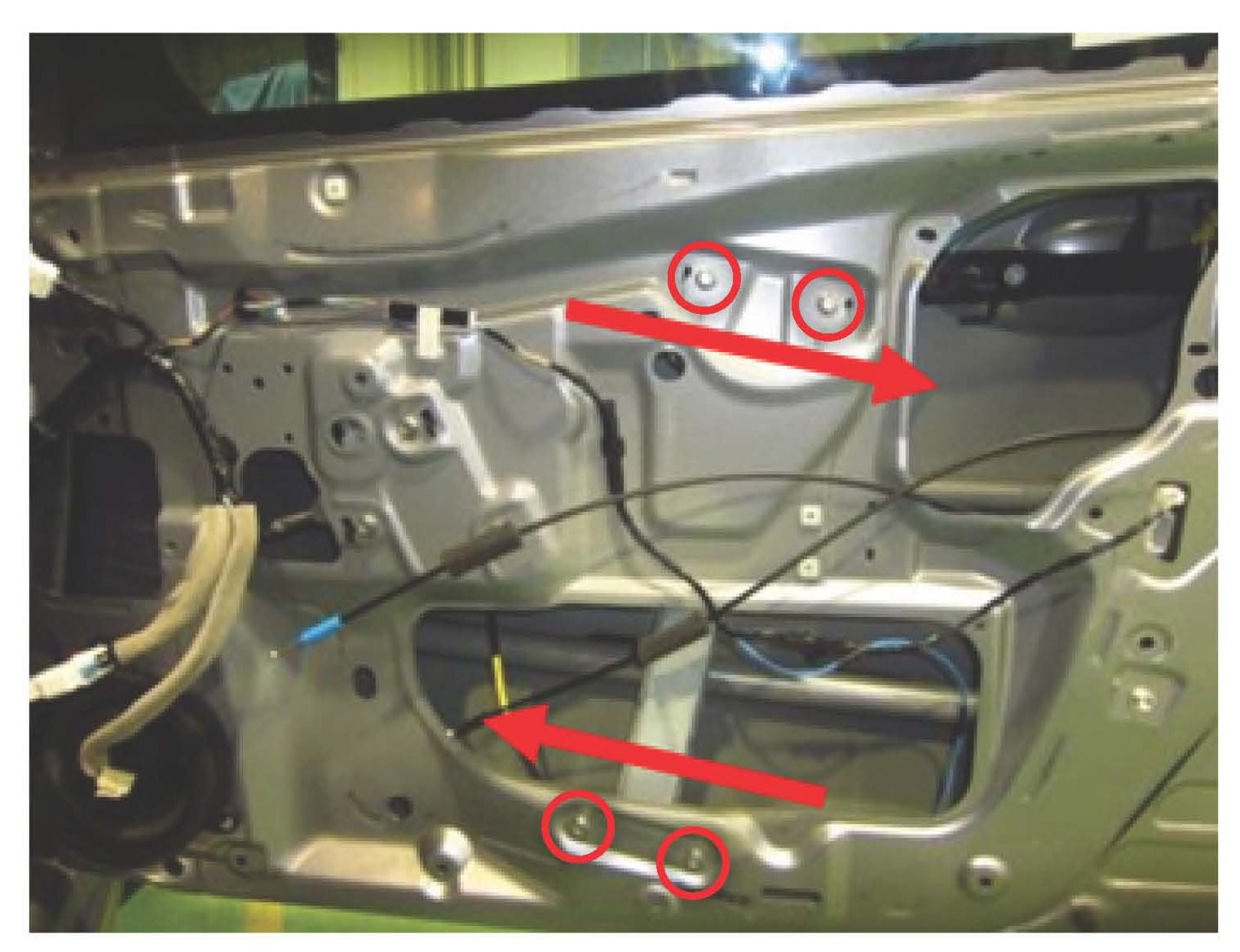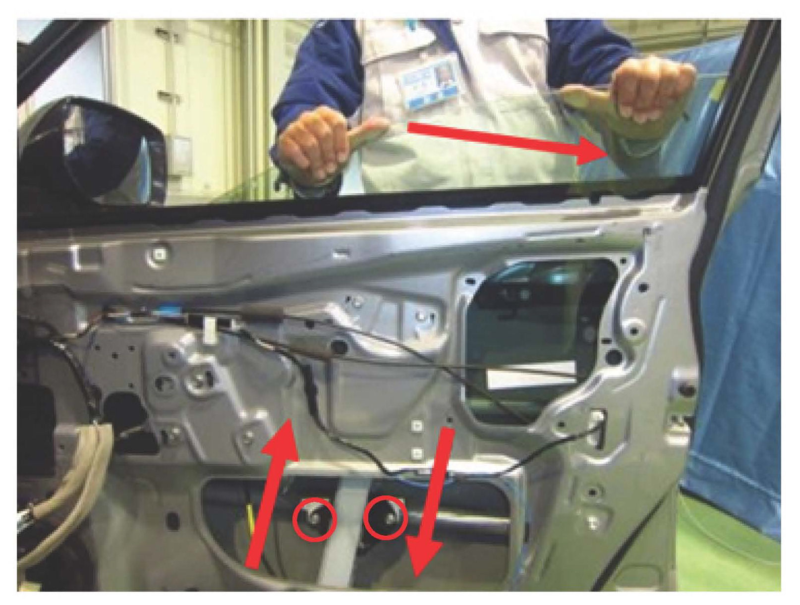 ^ Next, re-install the window glass and attach it to the regulator / motor assembly. Utilizing the same method used when installing the regulator / motor assembly, hold the glass in the leaning backward position as shown in the photo. Torque the 2 bolts to 7.5 Nm (5.5 ft.lbs.).