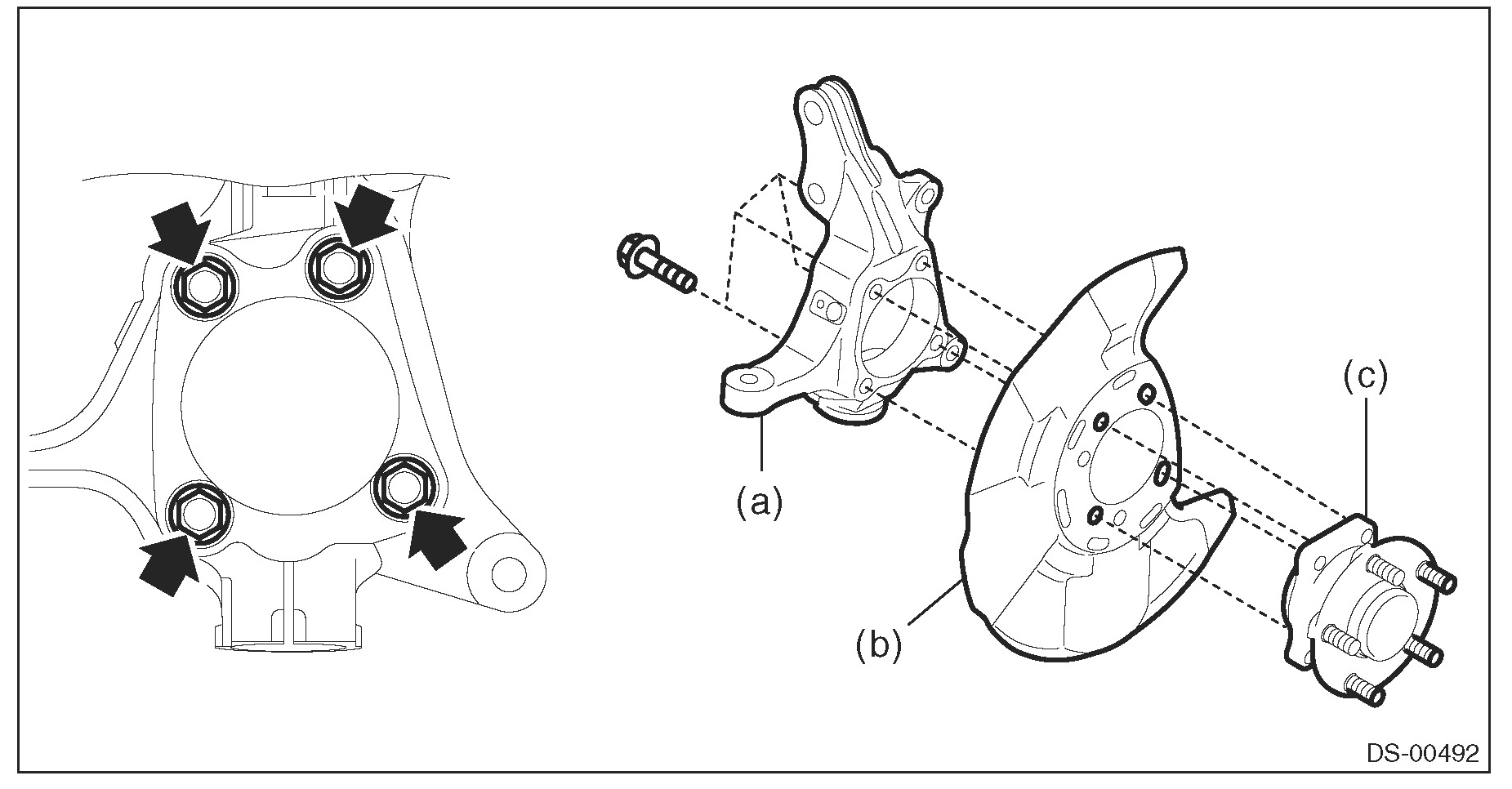 2) Install the front axle housing (a) and front hub unit bearing (c) to the disc brake cover (b) as shown in the figure, and tighten the bolt.