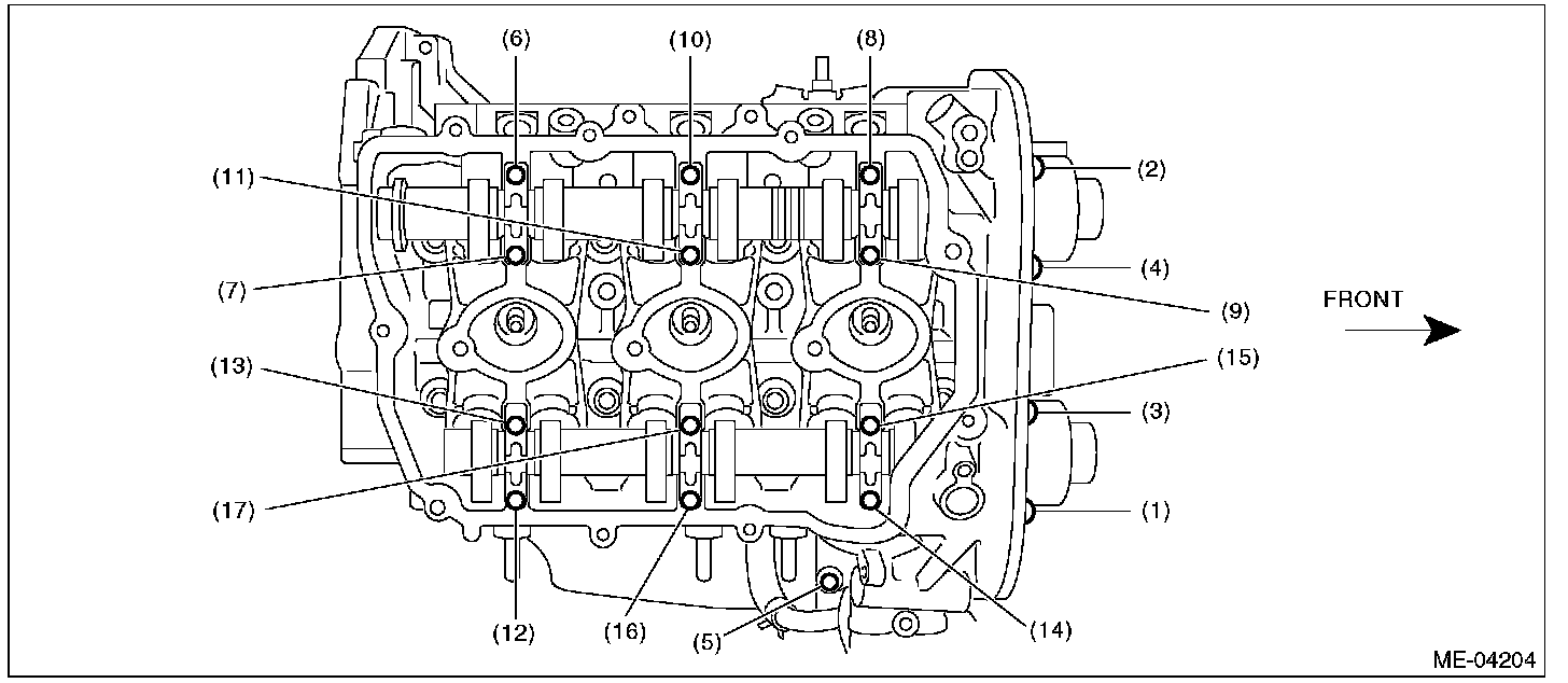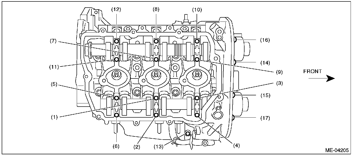 10) Loosen the camshaft cap bolts equally, a little at a time in numerical sequence as shown in the figure.
