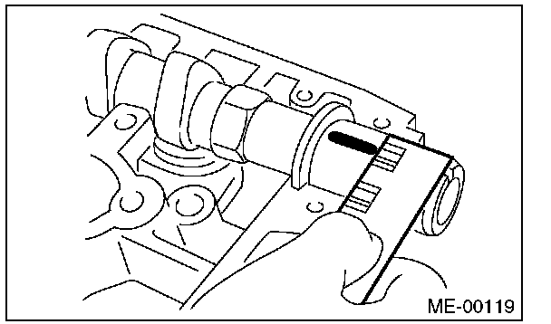 8) Measure the thrust clearance with setting the dial gauge at end surface of camshaft. If the thrust clearance is not within the standard or there is offset wear, replace the camshaft caps and cylinder head as a set. If necessary replace the camshaft.