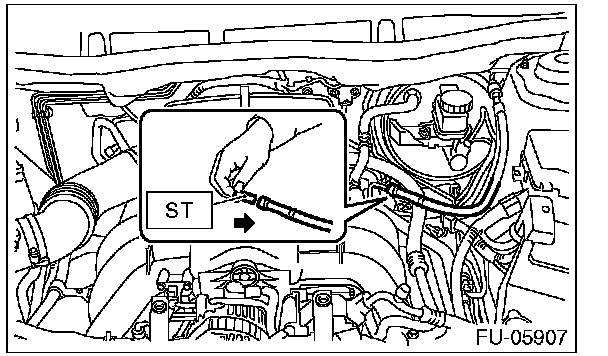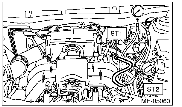 (2) Connect the fuel pressure gauge with ST1 and ST2.