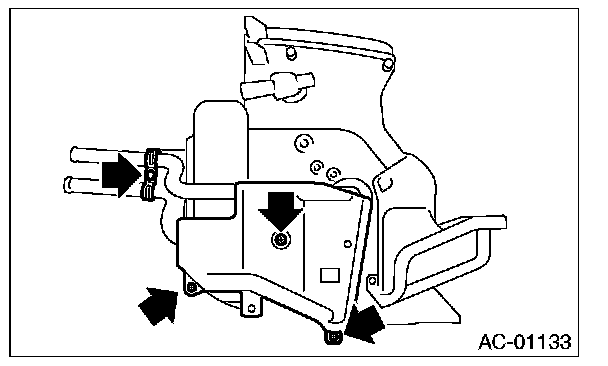 4. Remove the screws and remove the heater core cover and pipe clamp.