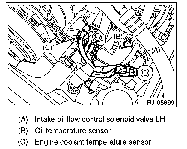 8. Disconnect the connectors of the oil temperature sensor, engine coolant temperature sensor and intake oil flow control solenoid valve LH.