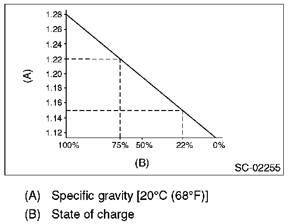 2. Measuring the specific gravity of the electrolyte in the battery will disclose the state of charge of the battery. The relation between specific gravity and state of charge is as shown in the figure.