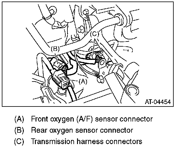 8) Disconnect the front oxygen (A/F) sensor, rear oxygen sensor and transmission harness connector.