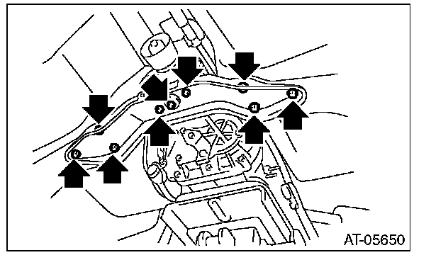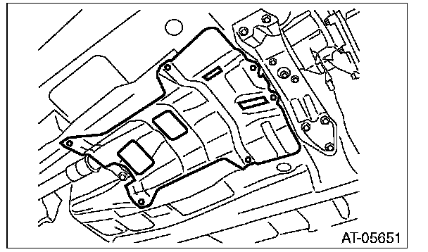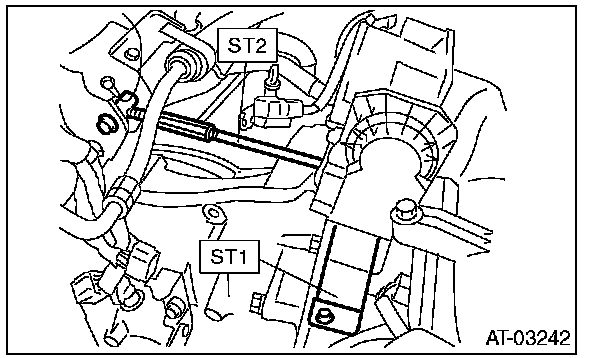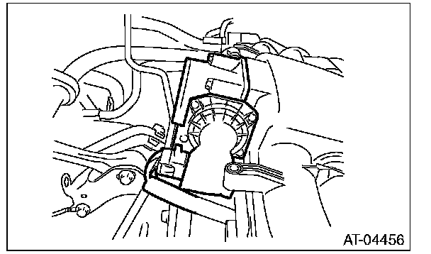 ^ Be careful not to allow breather pipe and etc. to touch the vehicle body when detaching the automatic transmission assembly by pulling it backward.