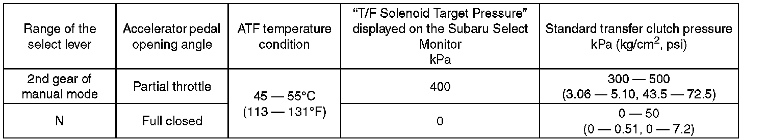 ^ Adjust the accelerator pedal opening angle in order to obtain the "T/F solenoid target pressure" displayed on the Subaru Select Monitor.