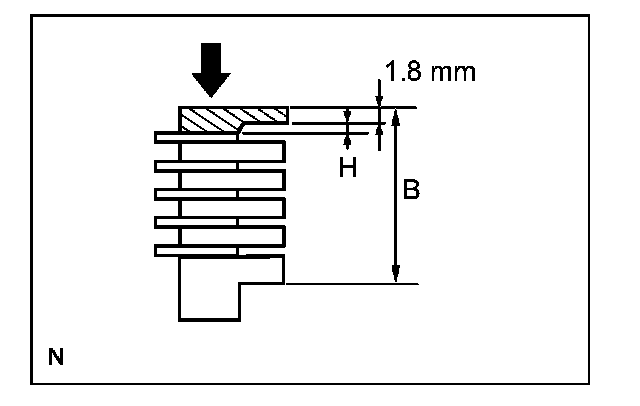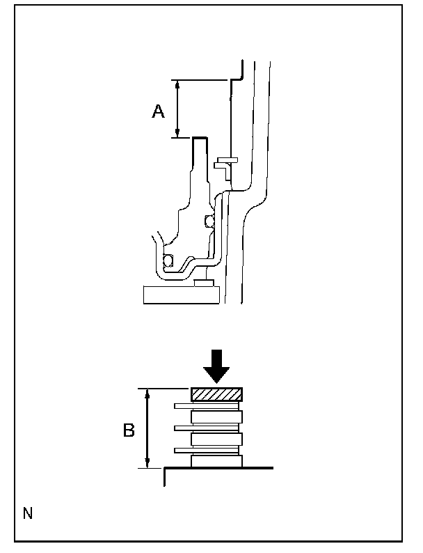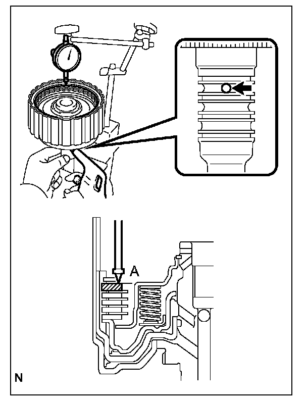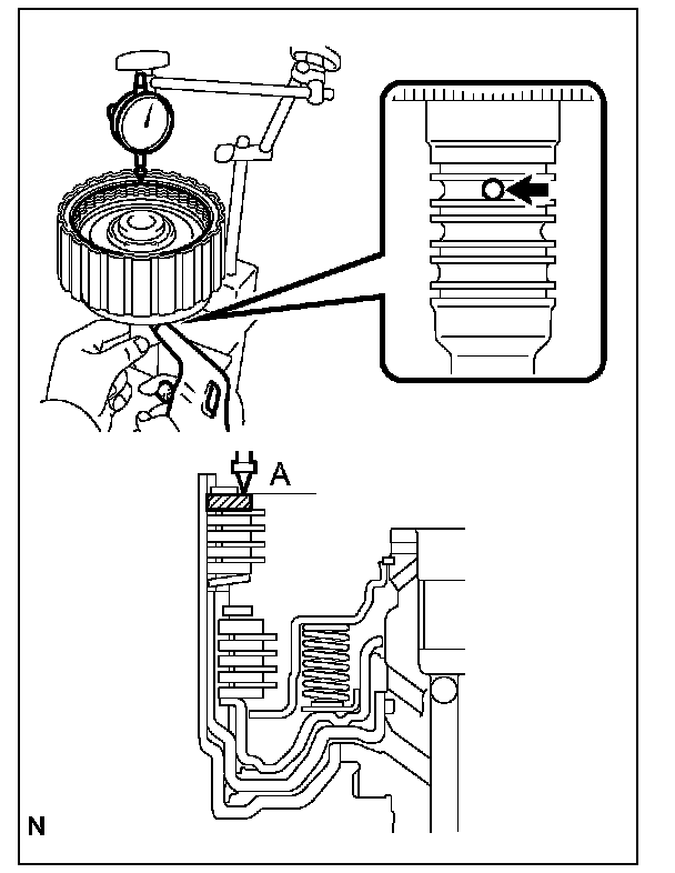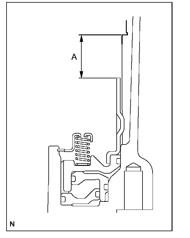(2) While applying a pressure of 4.9 N {0.5 kgf, 1.1 lbf} or less, measure height difference between the upper surface of the No.1 brake piston and the No.1 brake flange contact surface (dimension A) at both ends of the diameter of the No.1 brake piston.