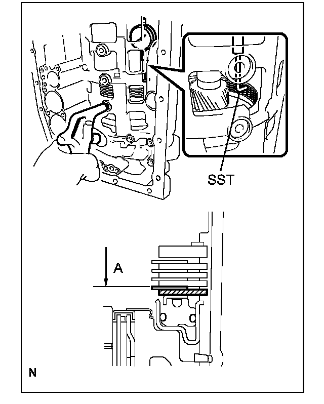 (2) While blowing compressed air (392 kPa {4.0 kgf/cm2, 57 psi}) into the oil hole as shown in the figure, use the SST to measure the travel distance of the No.2 brake disc (distance A) at both ends of the diameter, and calculate the average.