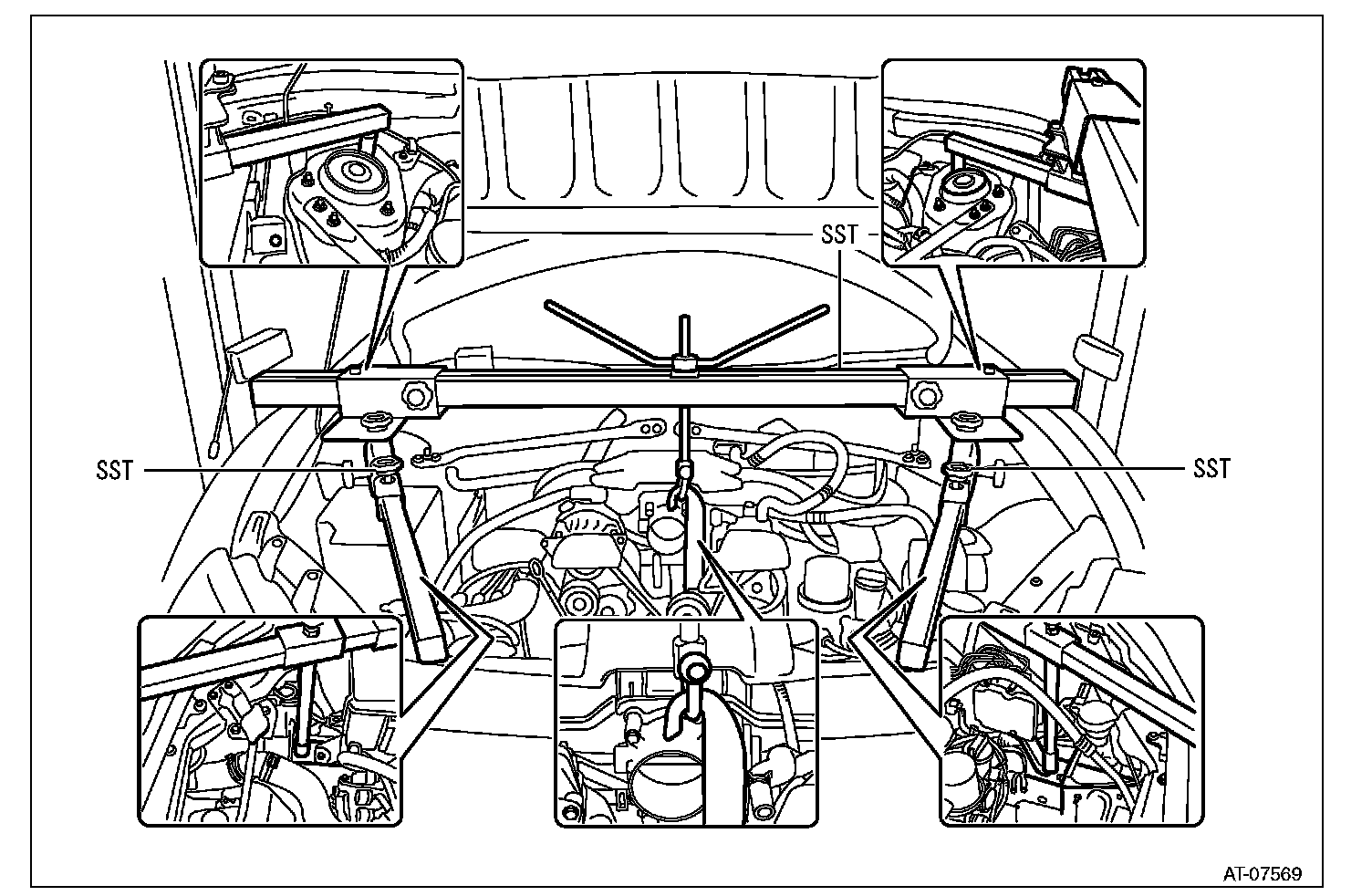 14. Turn the handle on the top of the SST clockwise to lift the engine gradually until the stud bolt of the engine mounting is pulled out from the engine mounting hole of the crossmember.