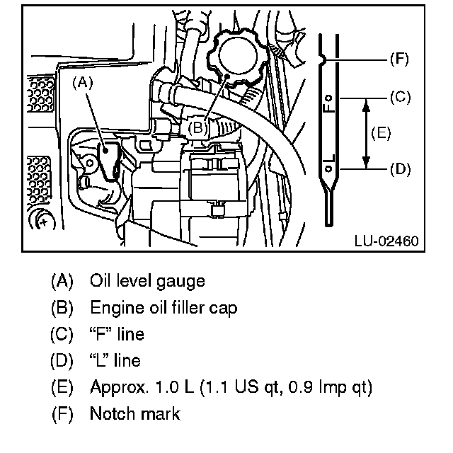 4) Pull out the oil level gauge again, and check the oil level. If the engine oil level is below "L" line, check for oil leakage from engine and add oil to bring the level up to "F" line.