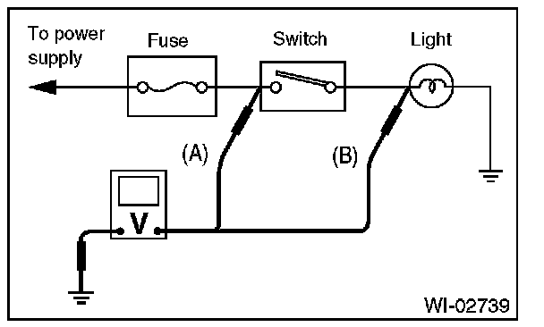 3. Touch connector (B) with the positive probe. The voltmeter will indicate no voltage.