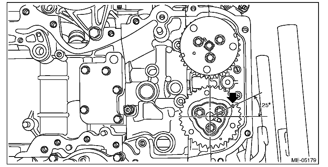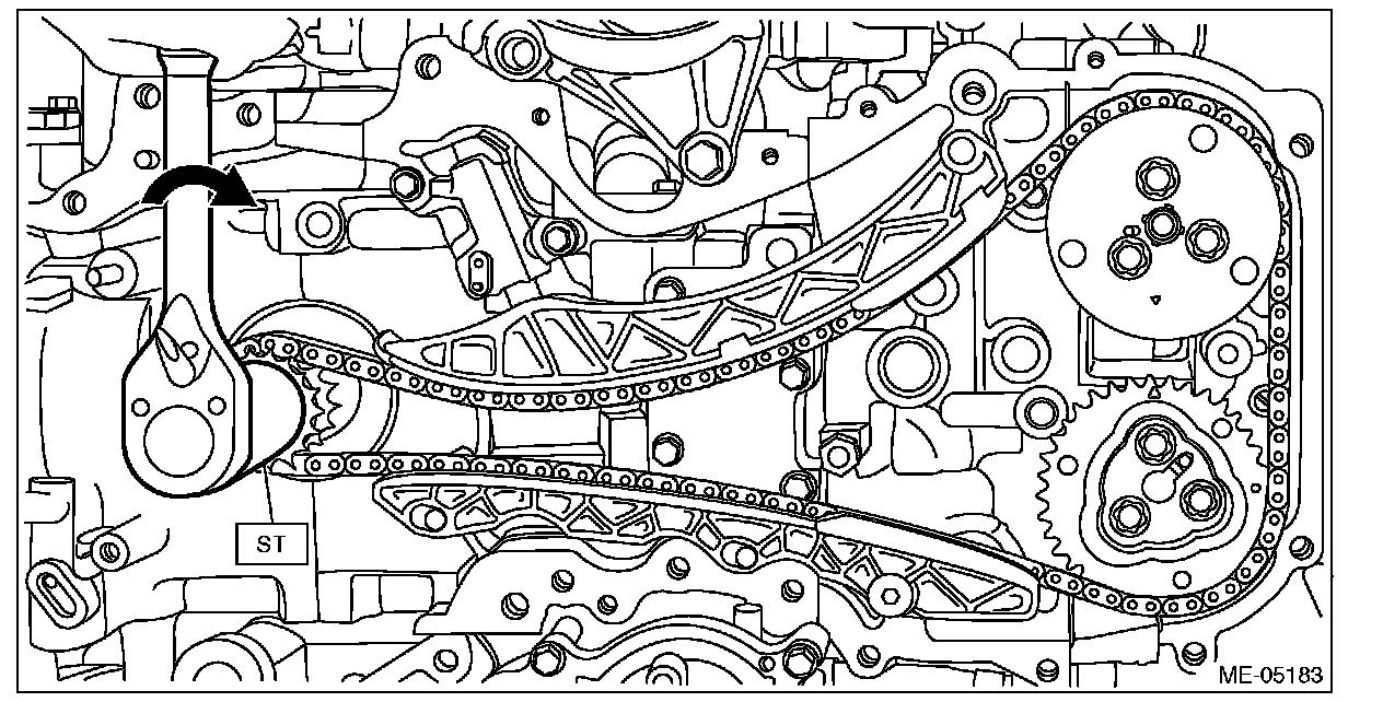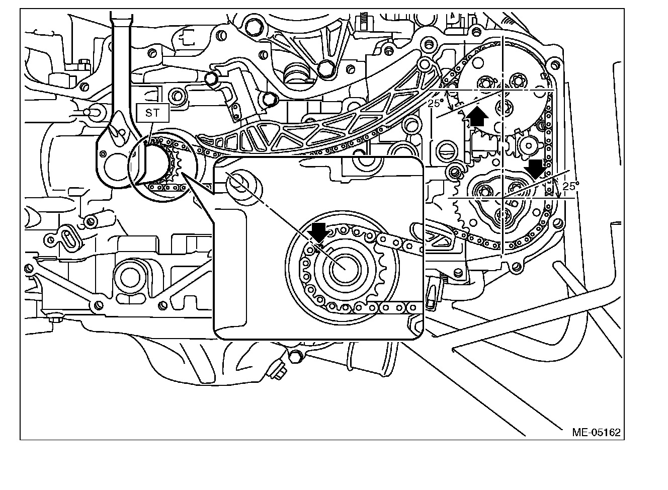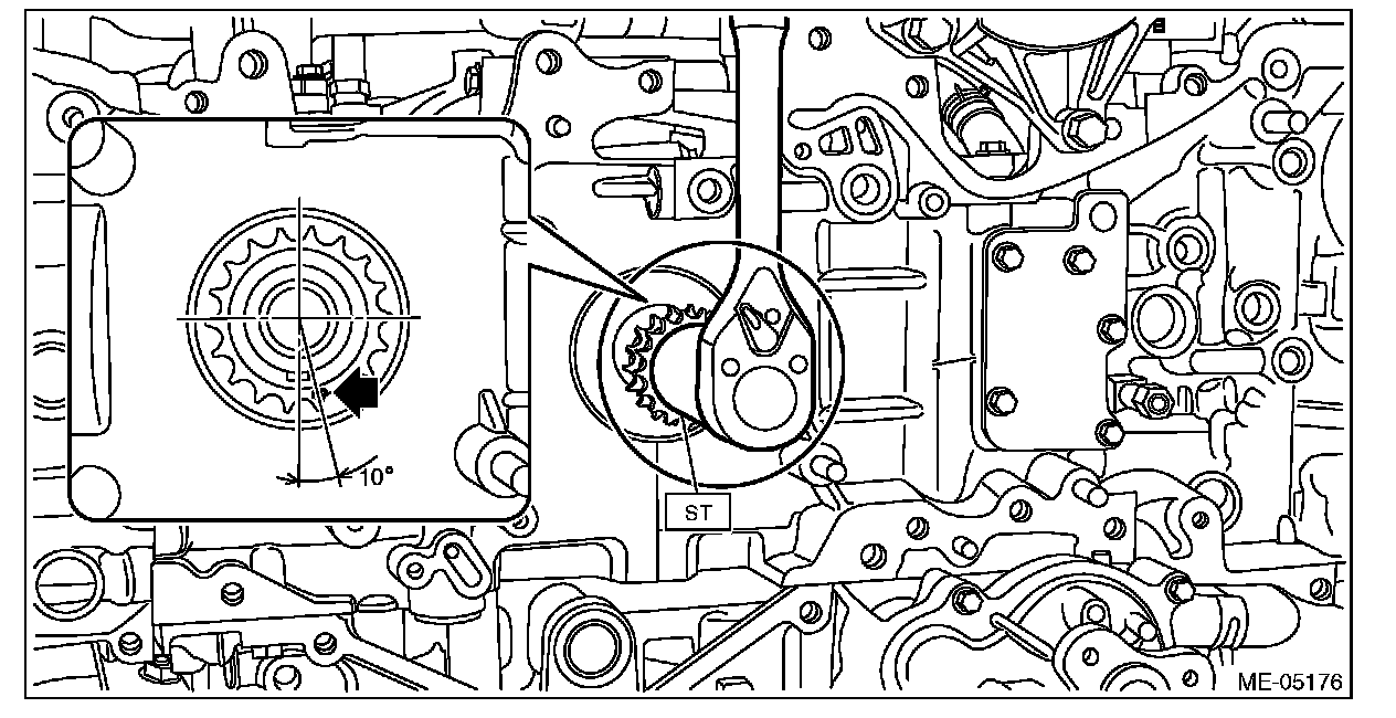 2) Check that the crank sprocket is located at the position sown in the figure. If not aligned, using ST turn the crankshaft to align the crank sprocket alignment mark to the position shown in the figure.