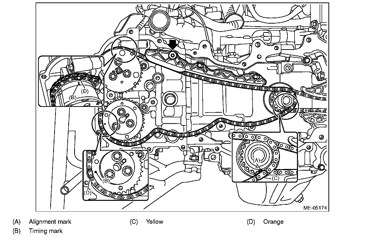 ^ Matching of the timing chain mark (orange) to the timing mark position of the exhaust cam sprocket LH.