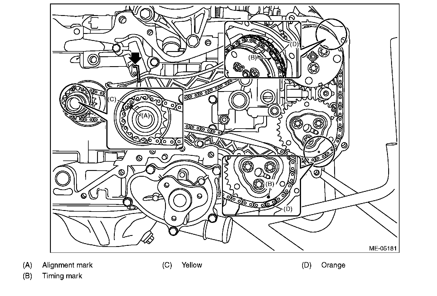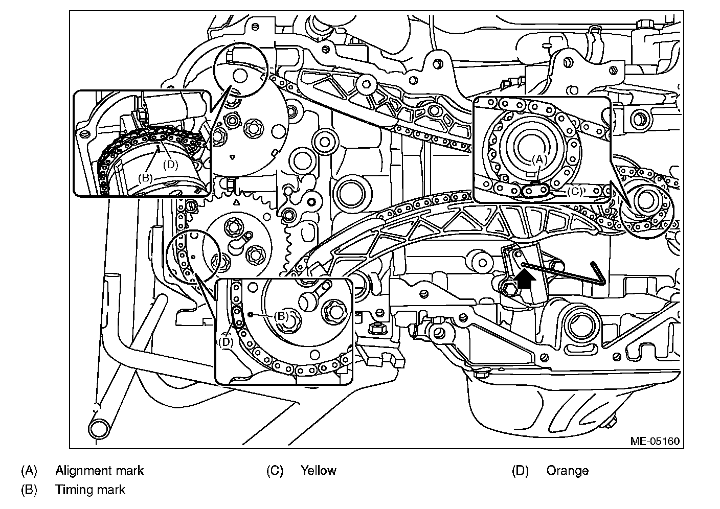 ^ Matching of the timing chain mark (orange) to the timing mark position of the intake cam sprocket LH.