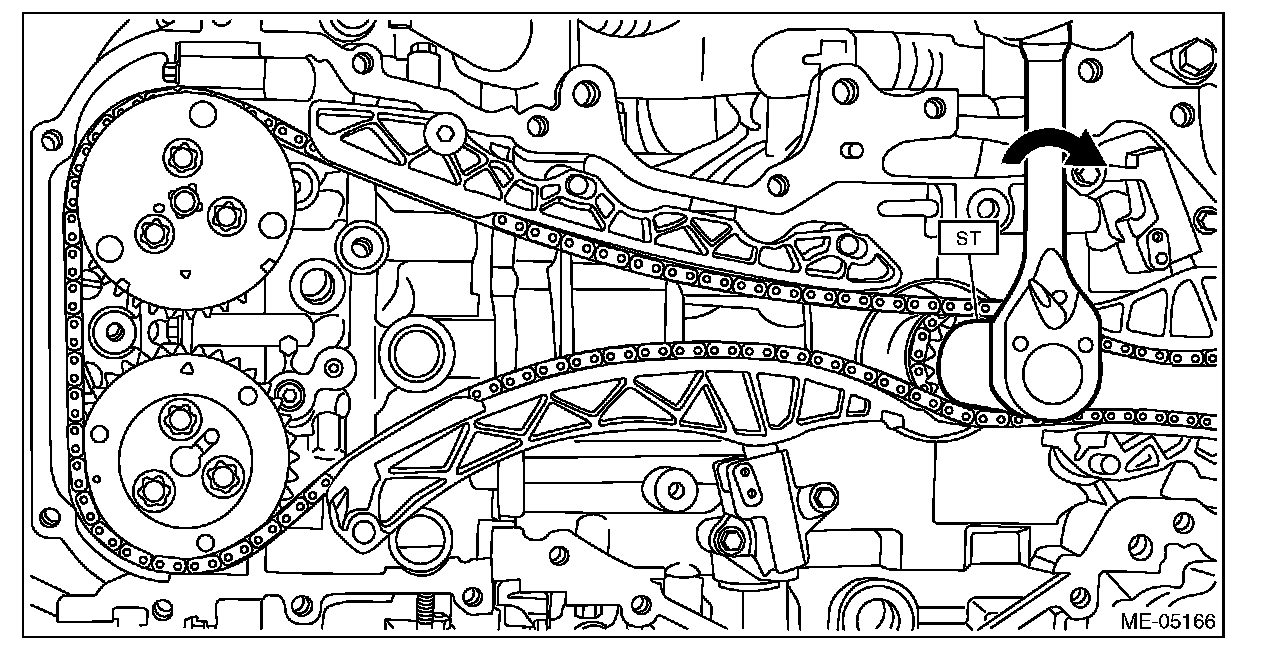 3) Using ST and by turning the crankshaft, align the alignment marks of crank sprocket, intake cam sprocket LH and exhaust cam sprocket LH to the positions as shown in the figure.