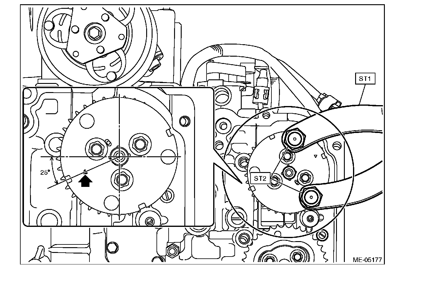 8) Using ST and by turning the intake cam sprocket LH approximately 180°, align the alignment marks of intake cam sprocket LH to the positions (zero-lift position) as shown in the figure.