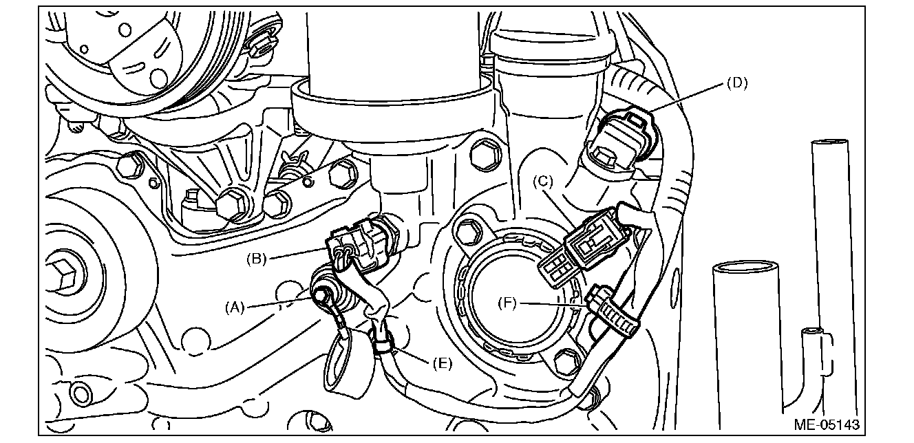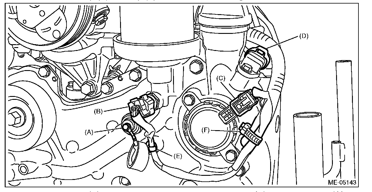8) Disconnect the terminal (A) from the oil pressure switch, and connector (B) from the engine oil temperature sensor, and connector (C) from the oil control solenoid LH, and connector (D) from the camshaft position sensor LH, and remove the clip (E) and clip (F) which secure the engine harness.