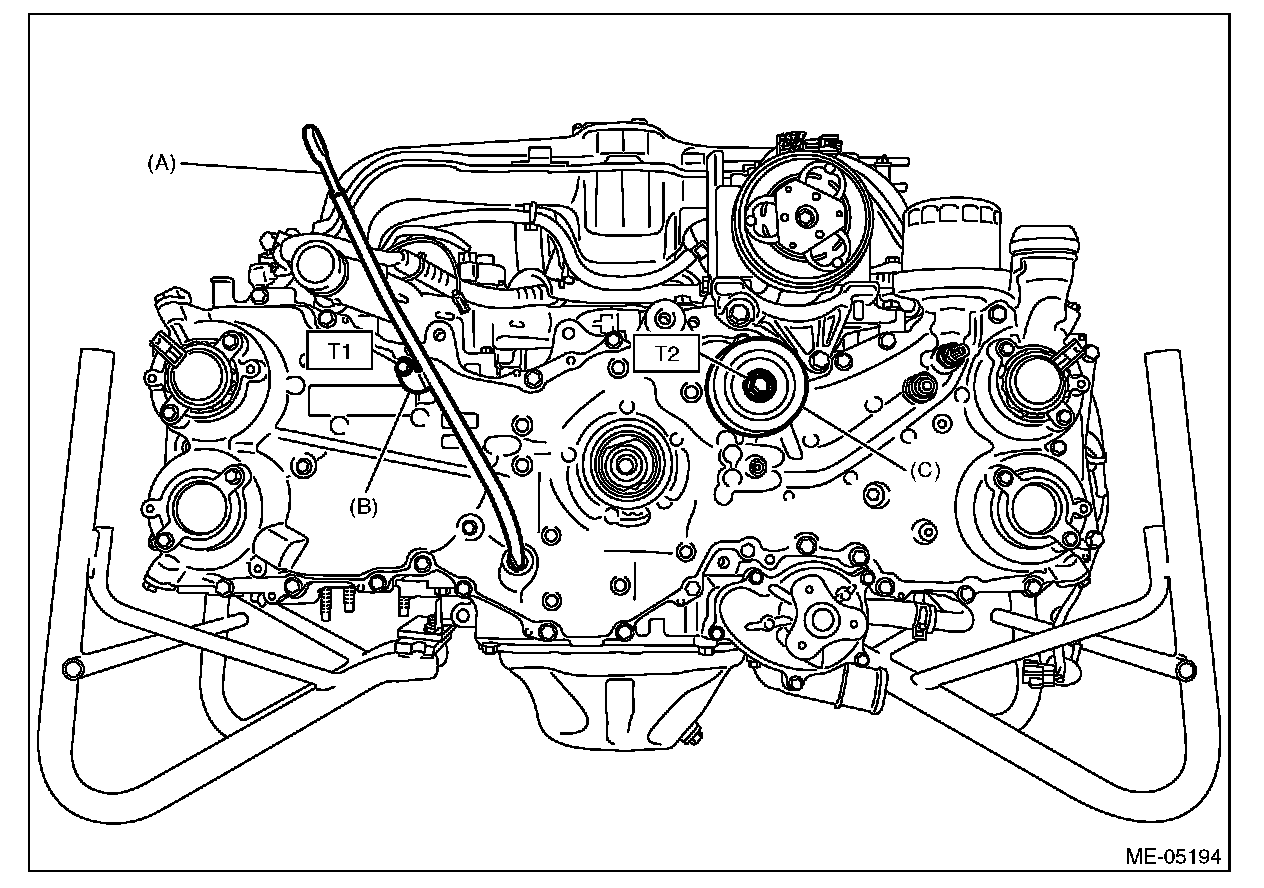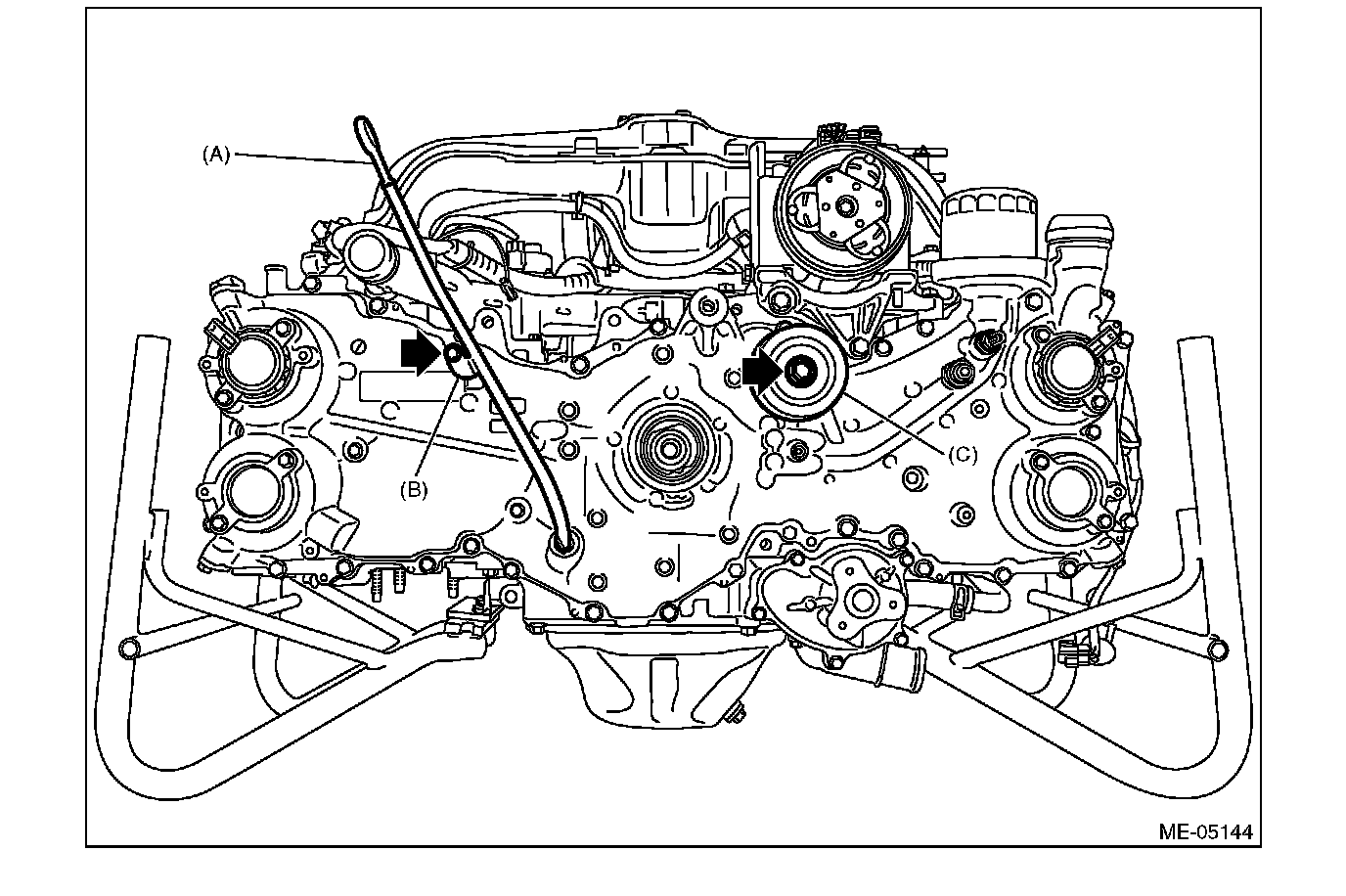 5) Install the idler pulley (C) and oil level gauge guide (B), and insert the oil level gauge (A).