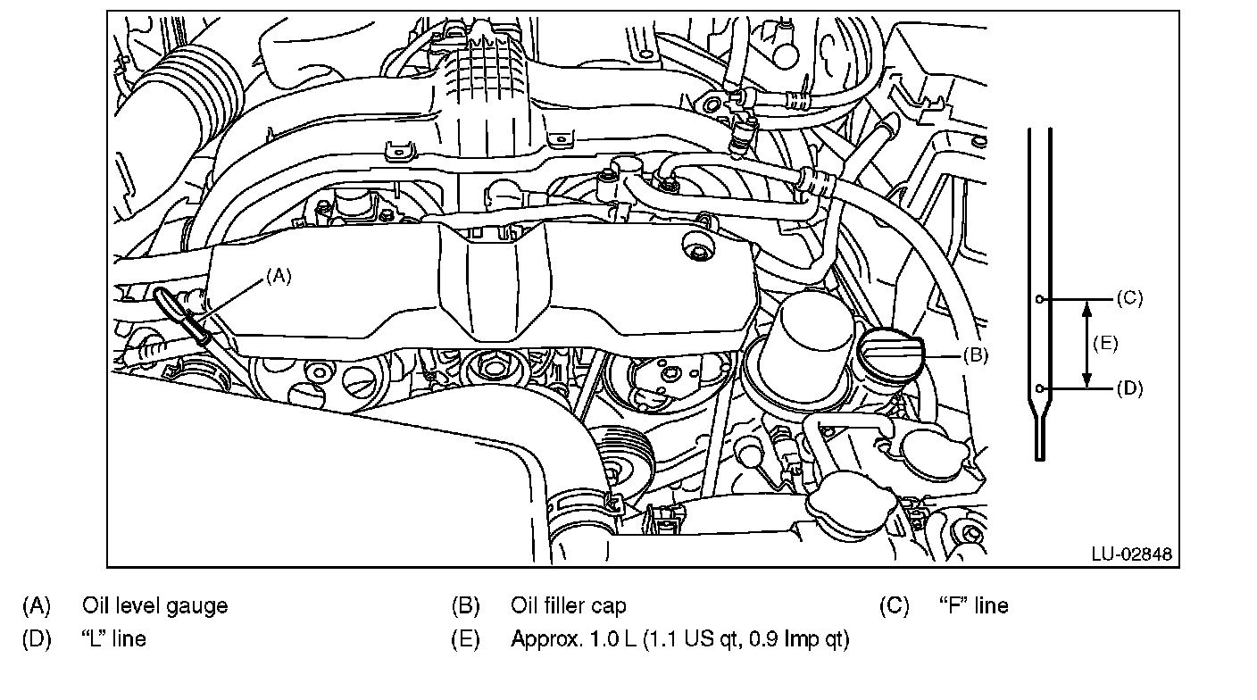 4) Pull out the oil level gauge again, and check the oil level. If the engine oil level is below "L" line, check for oil leakage from engine and add oil to bring the level up to "F" line.