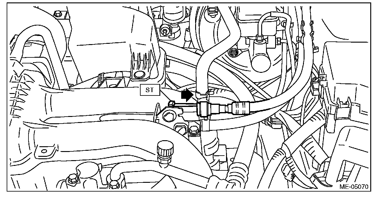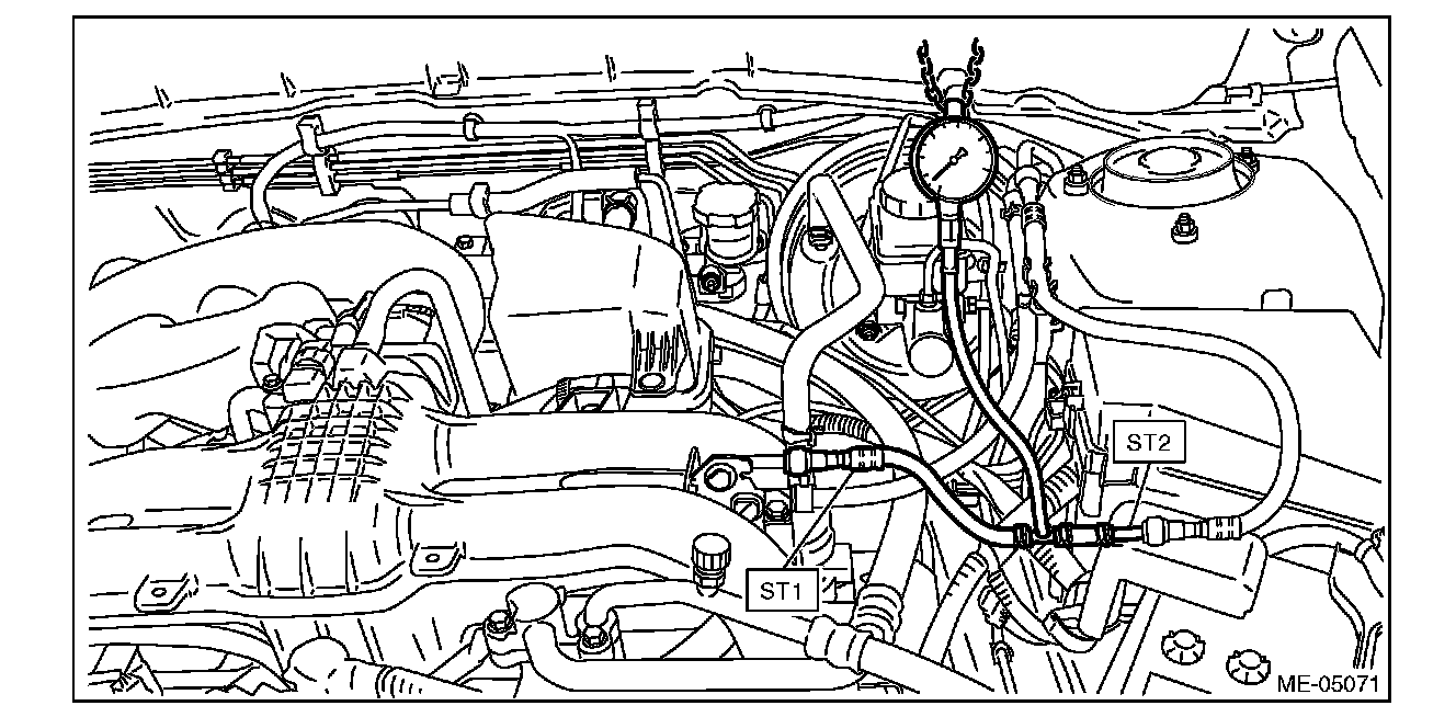 (2) Connect the fuel pressure gauge with ST1 and ST2.