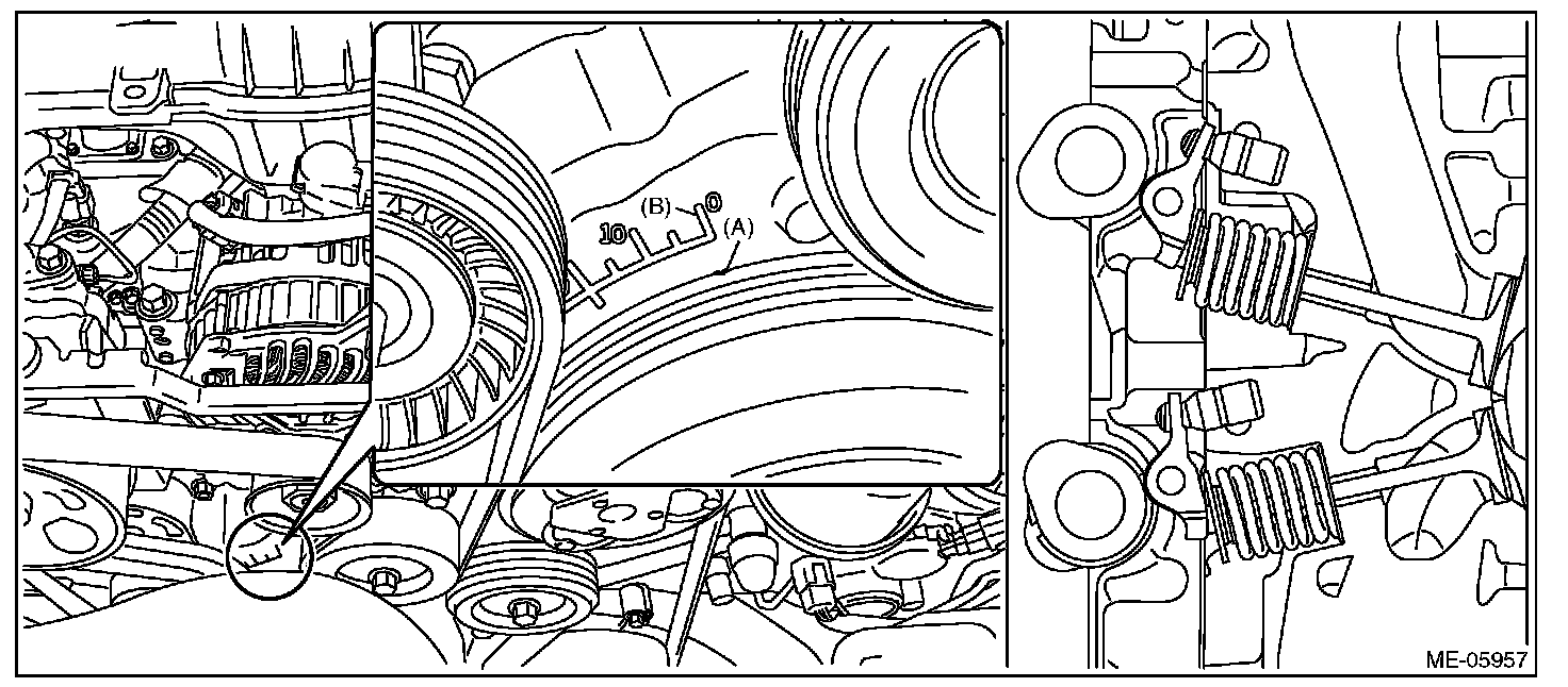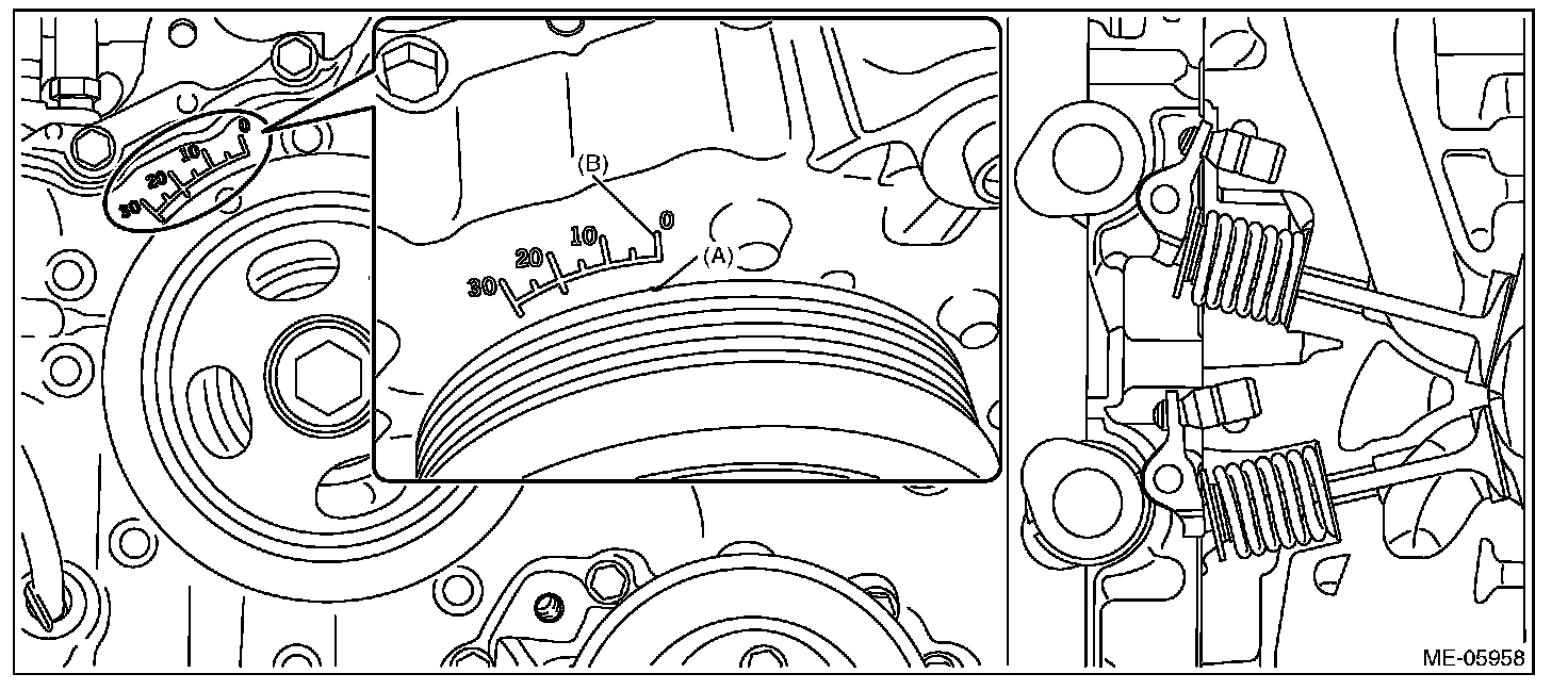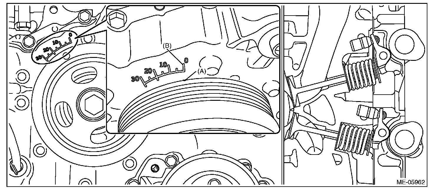 When the timing mark (A) on crank pulley is aligned to the 0° in timing gauge (B) on chain cover as shown in the figure, the #1 cylinder piston is located at TDC of compression stroke if the intake camshaft and exhaust camshaft does not depress the #1 cylinder intake side roller rocker arm (intake valve) and exhaust side roller rocker arm (exhaust valve). If roller rocker arm (valve) is depressed, turn the crank pulley by 360° in order to make #1 cylinder piston at TDC of compression stroke.
