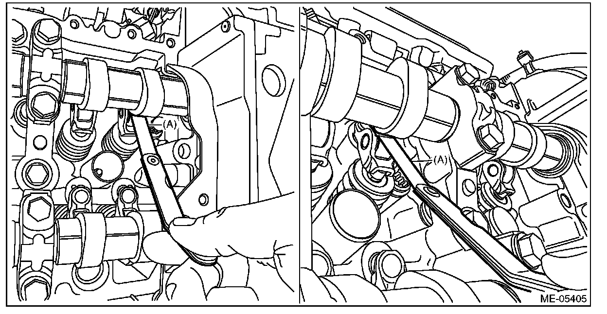 ^ For cam clearance inspection, adjust the cam base circle position so that the thickness gauge (A) can be inserted easily by hand turning the camshaft (cam sprocket) to be measured.