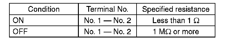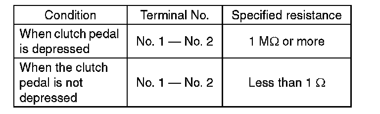 (2) Measure the resistance between terminal 1 and 2 of the switch. If the resistance is not within the specification, check the clutch stroke and installation condition, and check the clutch switch again.