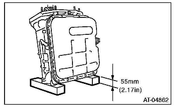 13) Place two wooden blocks on the workbench, and stand the transmission case with the rear end facing down.