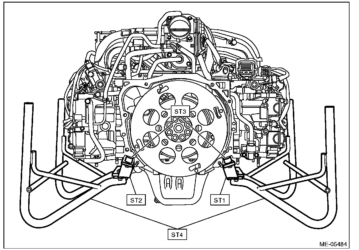1) After removing the engine from the vehicle body, attach the ST to the engine as shown in the figure.