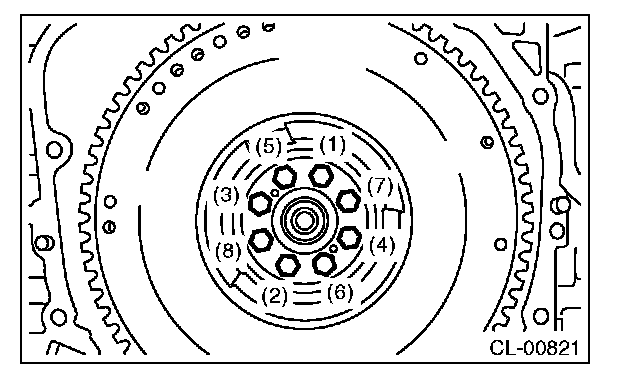 FlywheelTighten the flywheel mounting bolts in two stages.