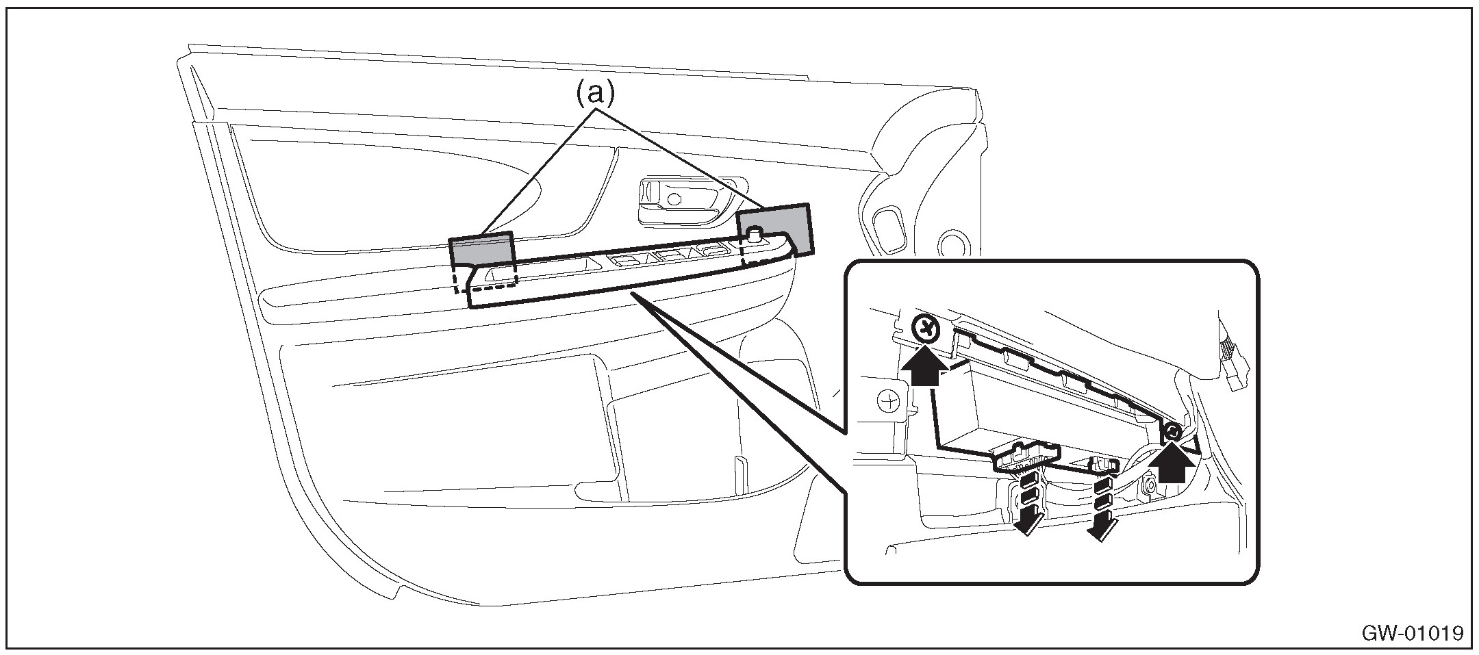 1. Insert a sheet of protective paper (a) between panel - power window sub switch rear and trim panel - rear door.