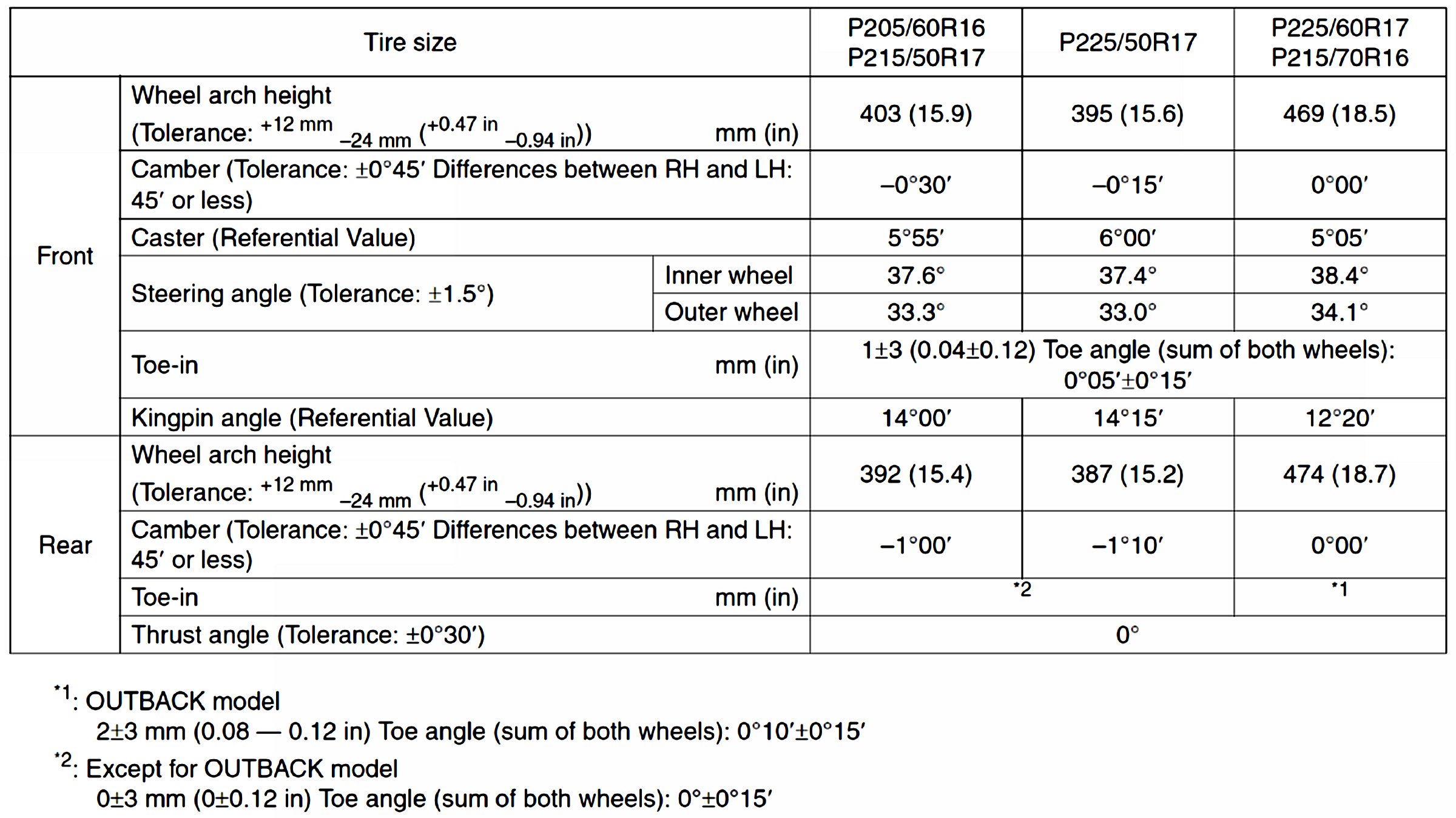 - Other items indicated in the specifications is not equipped with adjustment mechanisms. If other items exceed specifications, check the suspension parts and connections for deformation. If defective, replace with new parts.
