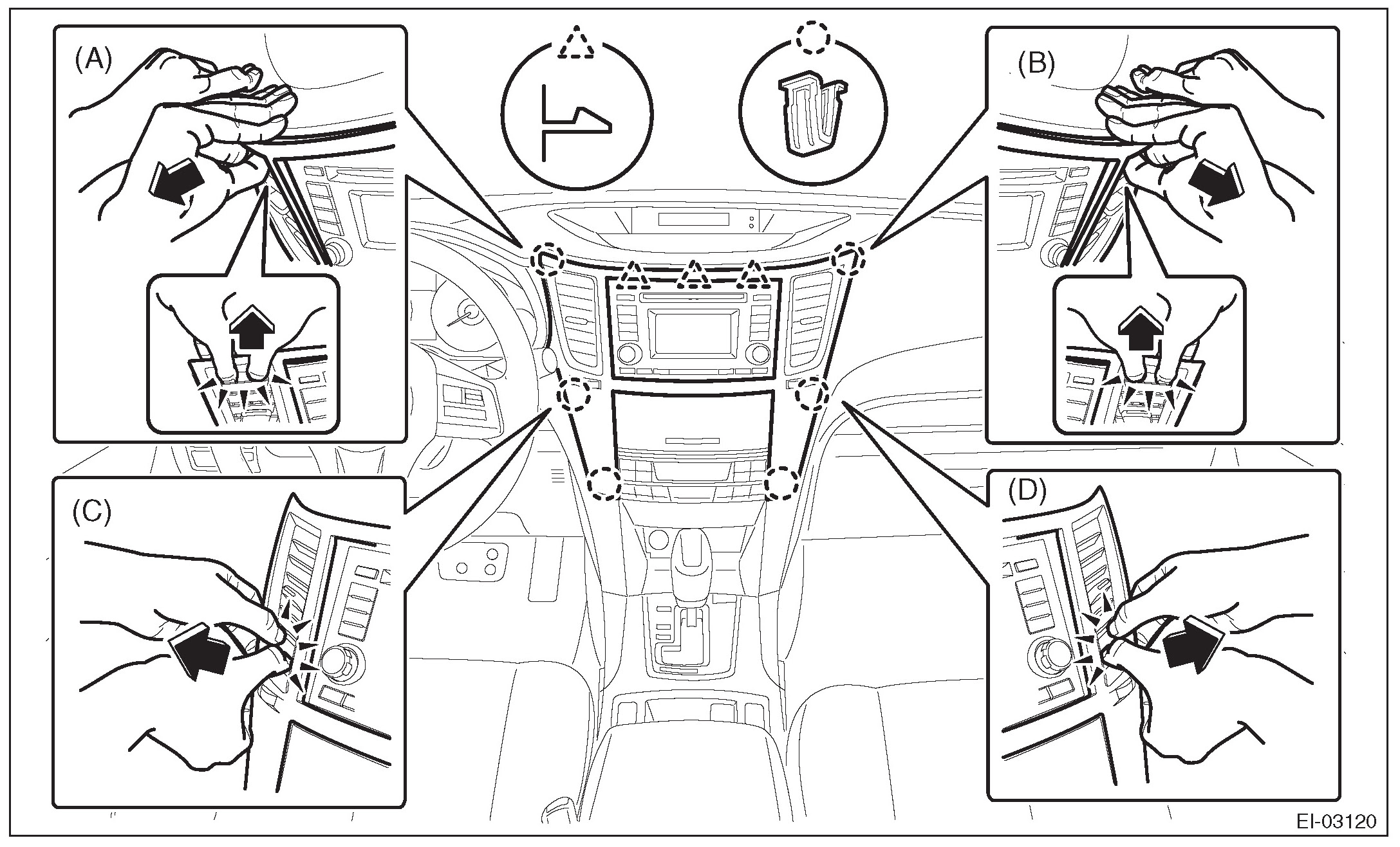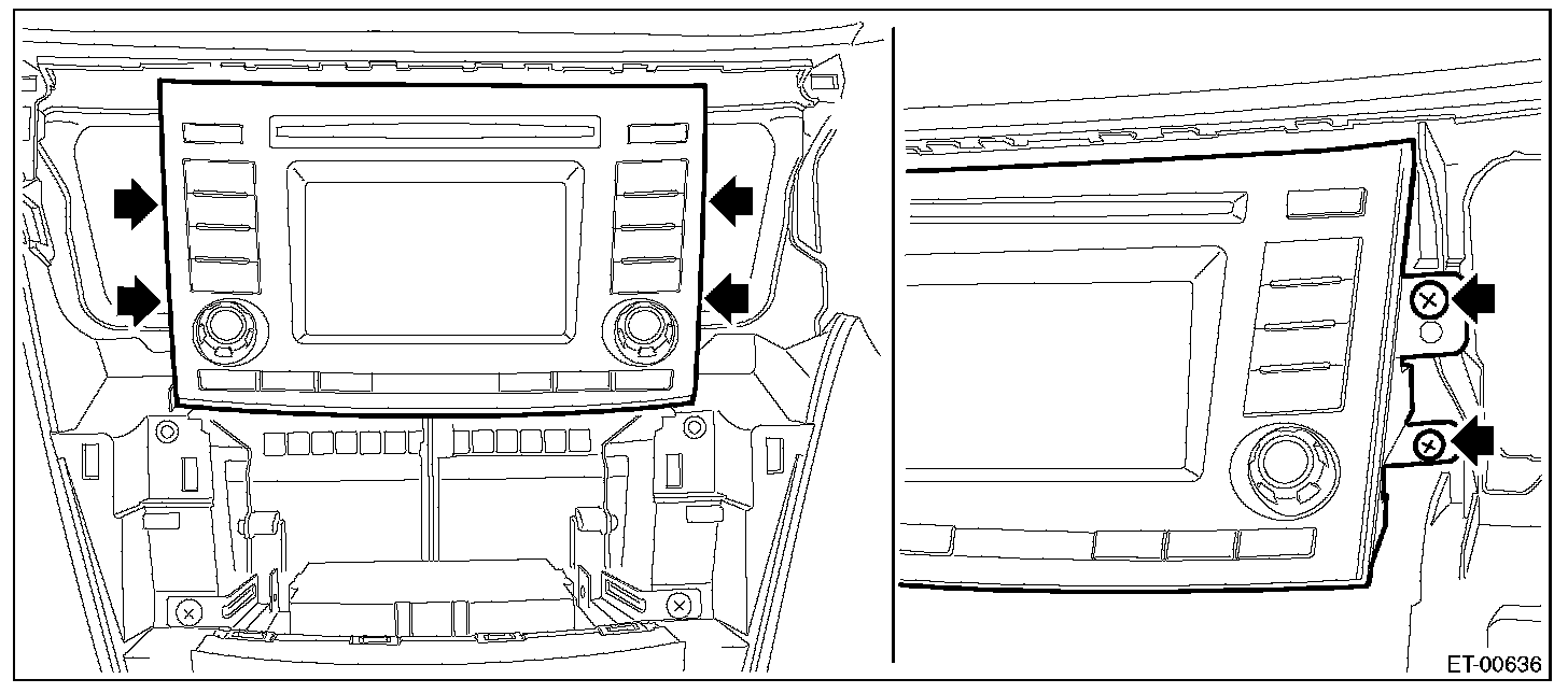 NOTE: An easy way of removal is to first remove the audio assembly or navigation assembly and push up the cover from the backside.