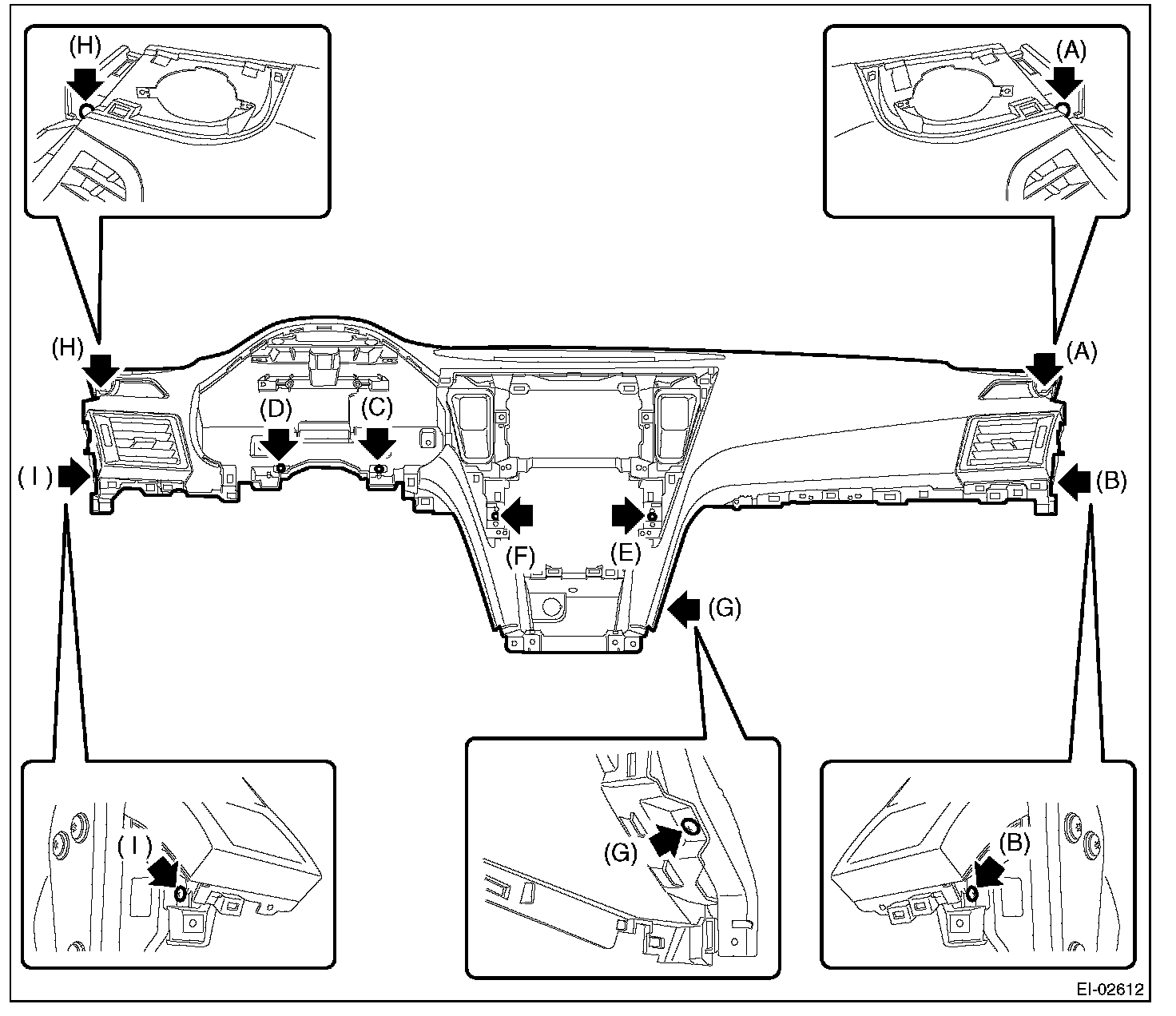 1. Remove the screws. (A), (B), (C), (D), (E), (F), (G), (H), (I)