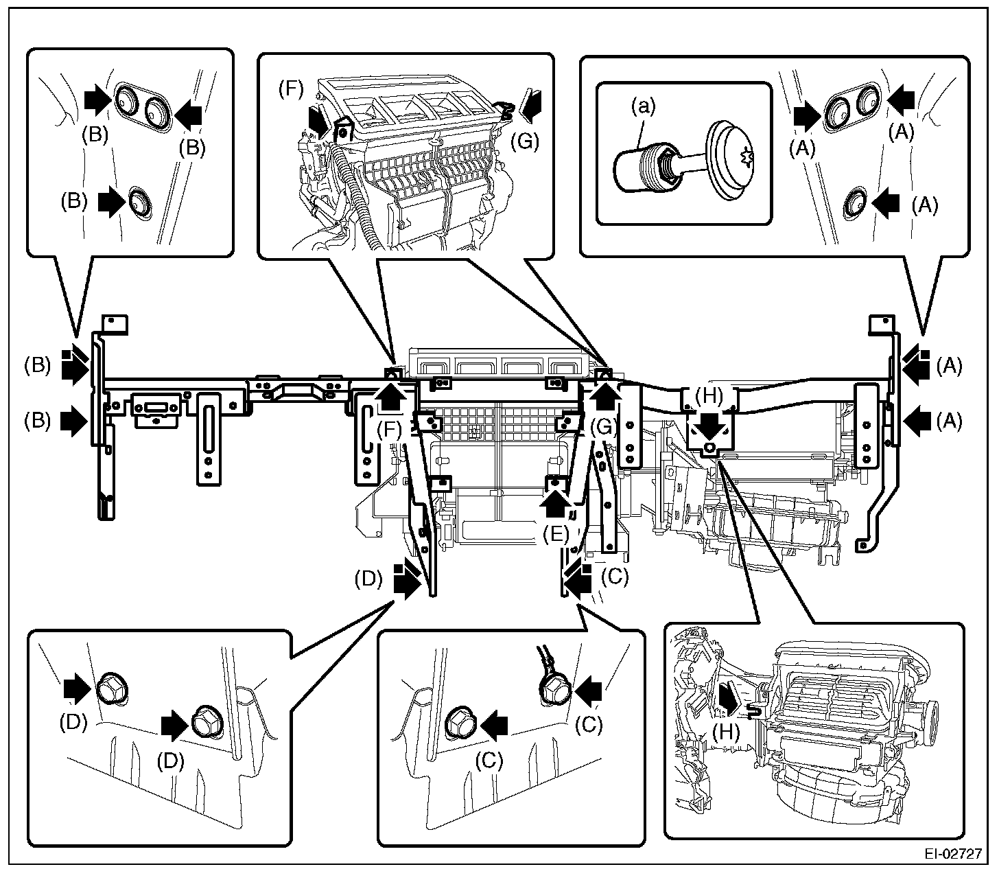 5. Remove the bolts at the floor center. (C), (D)