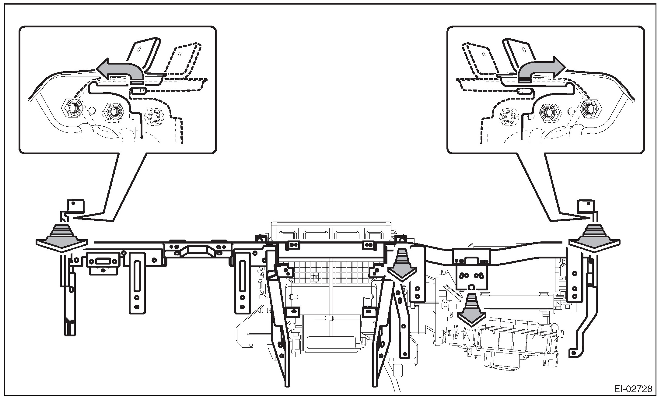 8. Slightly lift the steering support beam assembly to detach the left and right pins. Then pull it toward you to remove the assembly.